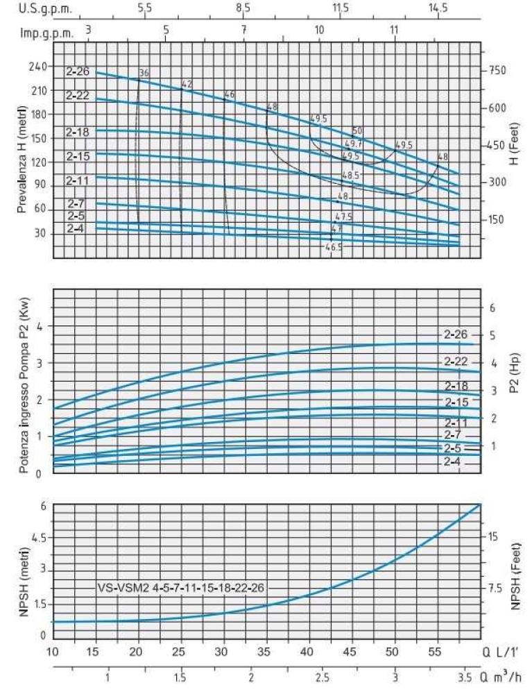 Универсальный многоступенчатый вертикальный насос Speroni серии VS/VSM с конструкцией патрубков «в линию». Применяется для бытового и коммунального водоснабжения, для перекачивания чистых взрывобезопасных жидкостей, не содержащих твердых и абразивных частиц, для полива в сельском хозяйстве, в системах кондиционирования, водоподготовки, обратно осмотических системах. Температура жидкости от 0°С до 110°С. Температура окружающей среды не более 40°С. Максимальное рабочее давление 25 бар. Стандартный электромотор (2900 об/мин) IM V1(IEC 34-7), класс изоляции F, класс защиты IP55. Всасывающая и подающая часть корпуса, рабочее колесо, наружный кожух, фланцы, верхняя и нижняя крышка, вал насоса изготовлены из нержавеющей стали AISI 304. Механическое торцевое уплотнение графит/кремний.