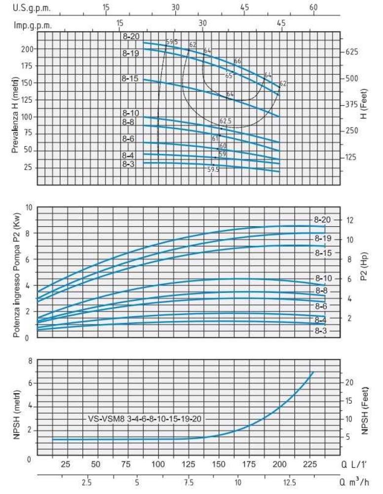 Универсальный многоступенчатый вертикальный насос Speroni серии VS/VSM с конструкцией патрубков «в линию». Применяется для бытового и коммунального водоснабжения, для перекачивания чистых взрывобезопасных жидкостей, не содержащих твердых и абразивных частиц, для полива в сельском хозяйстве, в системах кондиционирования, водоподготовки, обратно осмотических системах. Температура жидкости от 0°С до 110°С. Температура окружающей среды не более 40°С. Максимальное рабочее давление 25 бар. Стандартный электромотор (2900 об/мин) IM V1(IEC 34-7), класс изоляции F, класс защиты IP55. Всасывающая и подающая часть корпуса, рабочее колесо, наружный кожух, фланцы, верхняя и нижняя крышка, вал насоса изготовлены из нержавеющей стали AISI 304. Механическое торцевое уплотнение графит/кремний.