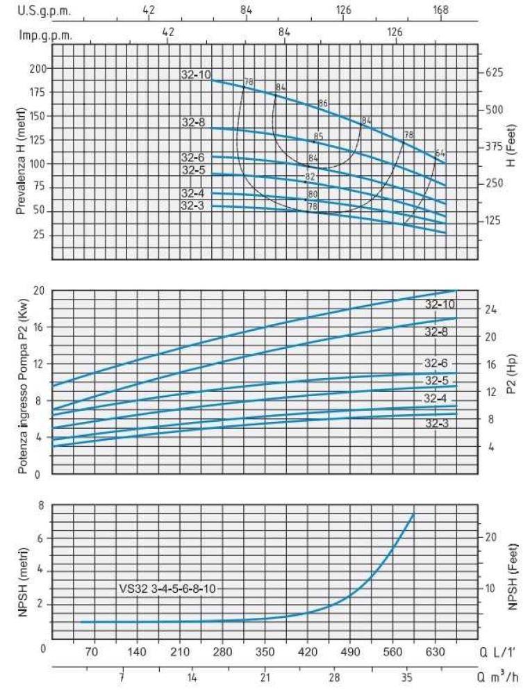 Универсальный многоступенчатый вертикальный насос Speroni серии VS/VSM с конструкцией патрубков «в линию». Применяется для бытового и коммунального водоснабжения, для перекачивания чистых взрывобезопасных жидкостей, не содержащих твердых и абразивных частиц, для полива в сельском хозяйстве, в системах кондиционирования, водоподготовки, обратно осмотических системах. Температура жидкости от 0°С до 110°С. Температура окружающей среды не более 40°С. Максимальное рабочее давление 25 бар. Стандартный электромотор (2900 об/мин) IM V1(IEC 34-7), класс изоляции F, класс защиты IP55. Всасывающая и подающая часть корпуса, рабочее колесо, наружный кожух, фланцы, верхняя и нижняя крышка, вал насоса изготовлены из нержавеющей стали AISI 304. Механическое торцевое уплотнение графит/кремний.