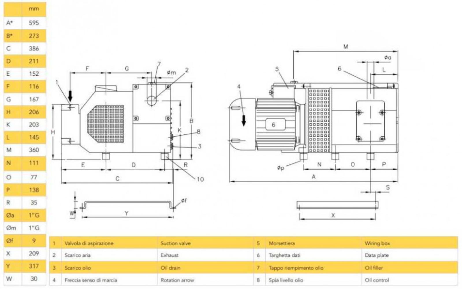 Корпус насоса изготовлен из высококачественного чугуна, масляный и воздушный сепаратор из алюминия. Двигатель соединен с рабочим органом при помощи гибкой муфты.