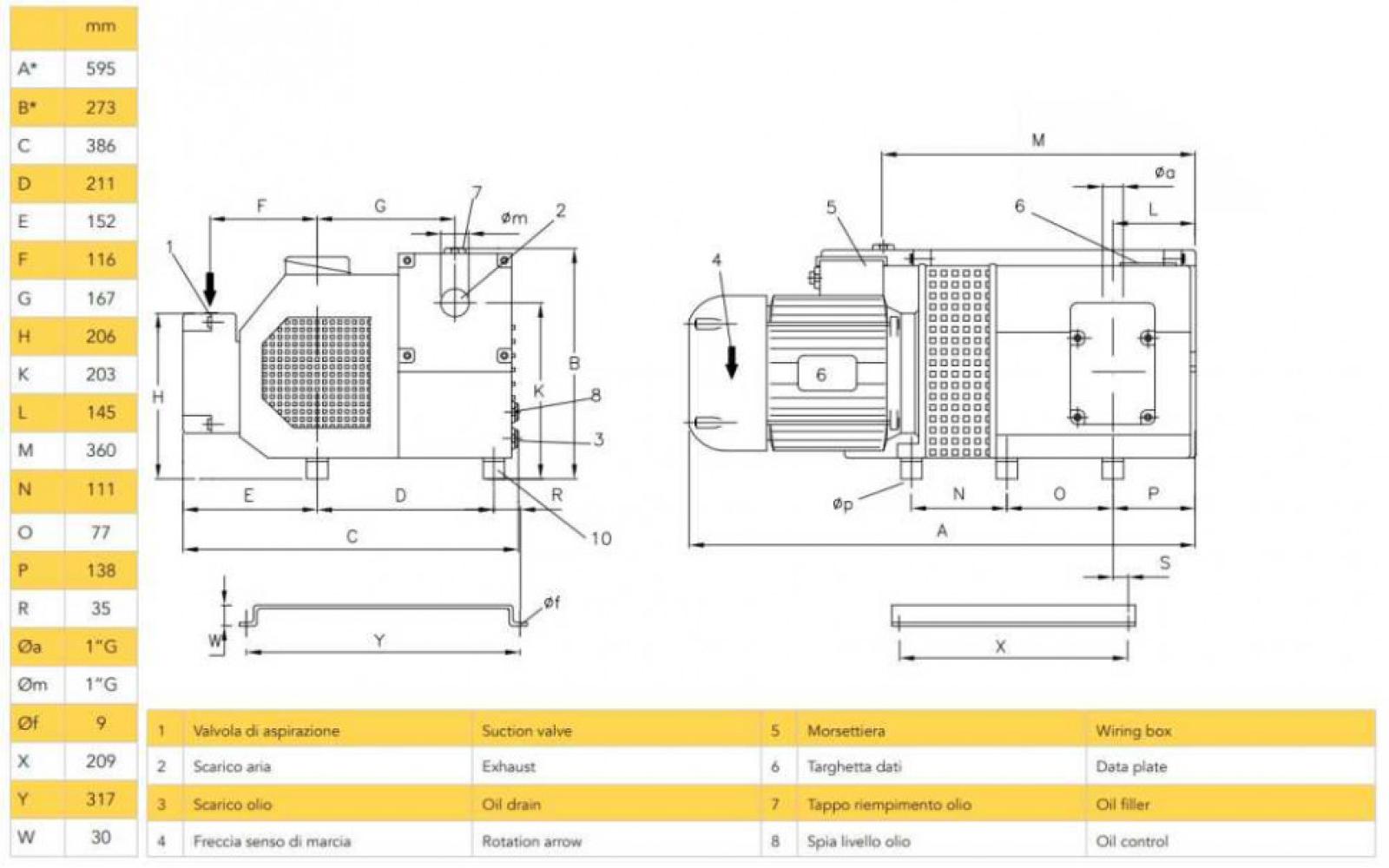 Корпус насоса изготовлен из высококачественного чугуна, масляный и воздушный сепаратор из алюминия. Двигатель соединен с рабочим органом при помощи гибкой муфты.