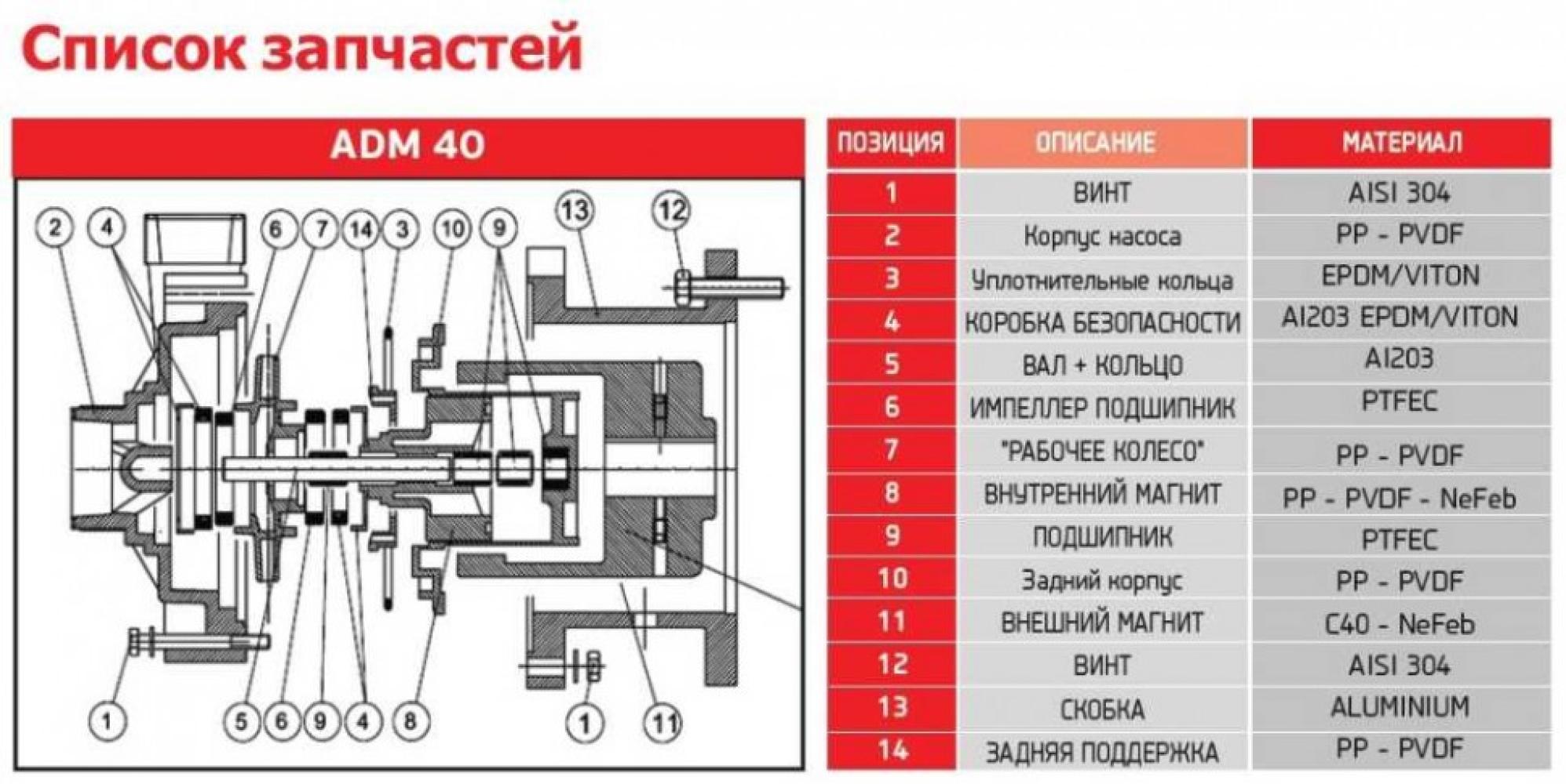Благодаря инновационной магнитной системе движения модель насоса ADM PP / PVDF снижает опасность потери и стоимость технического обслуживания. Крутящий момент электродвигателя передается насосу магнитной муфтой без механического контакта. Это гарантирует максимальную безопасность и эффективность.