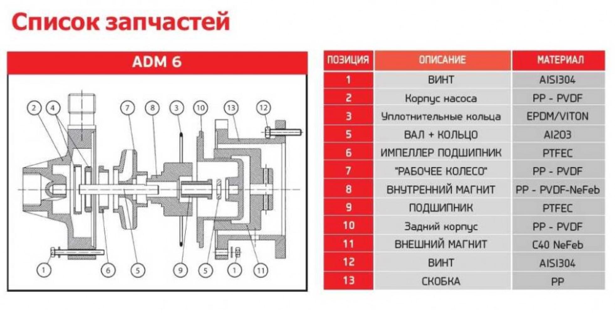 Благодаря инновационной магнитной системе движения модель насоса ADM PP / PVDF снижает опасность потери и стоимость технического обслуживания. Крутящий момент электродвигателя передается насосу магнитной муфтой без механического контакта. Это гарантирует максимальную безопасность и эффективность.