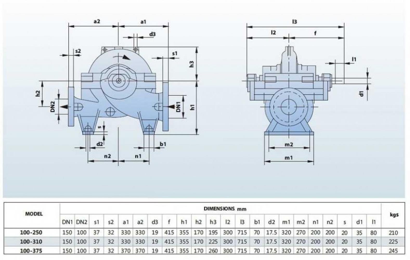 от других центробежных насосов является особенность подвода жидкости к рабочему колесу. Всасывание происходит таким образом, что жидкость попадает в крыльчатку лопастного типа с двух сторон. Физически это сделано для того, чтобы скомпенсировать осевую силу, которая в случае одностороннего подвода жидкости, воздействует на рабочее колесо в одном направлении. При незначительных параметрах насоса это не имеет значения. Поэтому насосы этого типа разработаны специально для задач, когда насос должен обладать большой производительностью. Вторым плюсом насосов двухстороннего входа является то, что они имеют всасывающий и напорный патрубки расположенные так, что подвод и отвод жидкости происходит горизонтально, а не под углом 900, как это выполнено у большинства центробежных насосов.. Этот плюс заключается в том, что легче производить установку таких насосных агрегатов. Еще один плюс конструкции насосов двустороннего входа BSC заключается в том, что насосная часть легко разбирается – верхняя крышка прикручена болтами, а не вылита целиком, как единый корпус, что бывает практически у всех моделей центробежных насосов. Это позволяет производить ремонт и обслуживание насосной части на месте без демонтажа агрегата от трубопровода.