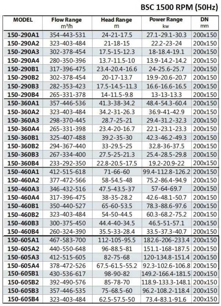 от других центробежных насосов является особенность подвода жидкости к рабочему колесу. Всасывание происходит таким образом, что жидкость попадает в крыльчатку лопастного типа с двух сторон. Физически это сделано для того, чтобы скомпенсировать осевую силу, которая в случае одностороннего подвода жидкости, воздействует на рабочее колесо в одном направлении. При незначительных параметрах насоса это не имеет значения. Поэтому насосы этого типа разработаны специально для задач, когда насос должен обладать большой производительностью. Вторым плюсом насосов двухстороннего входа является то, что они имеют всасывающий и напорный патрубки расположенные так, что подвод и отвод жидкости происходит горизонтально, а не под углом 900, как это выполнено у большинства центробежных насосов.. Этот плюс заключается в том, что легче производить установку таких насосных агрегатов. Еще один плюс конструкции насосов двустороннего входа BSC заключается в том, что насосная часть легко разбирается – верхняя крышка прикручена болтами, а не вылита целиком, как единый корпус, что бывает практически у всех моделей центробежных насосов. Это позволяет производить ремонт и обслуживание насосной части на месте без демонтажа агрегата от трубопровода.