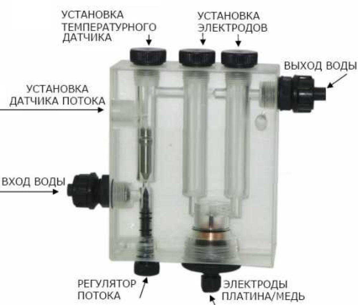 - проточный амперометрический датчик свободного (остаточного) хлора с медно-платиновыми электродами.
