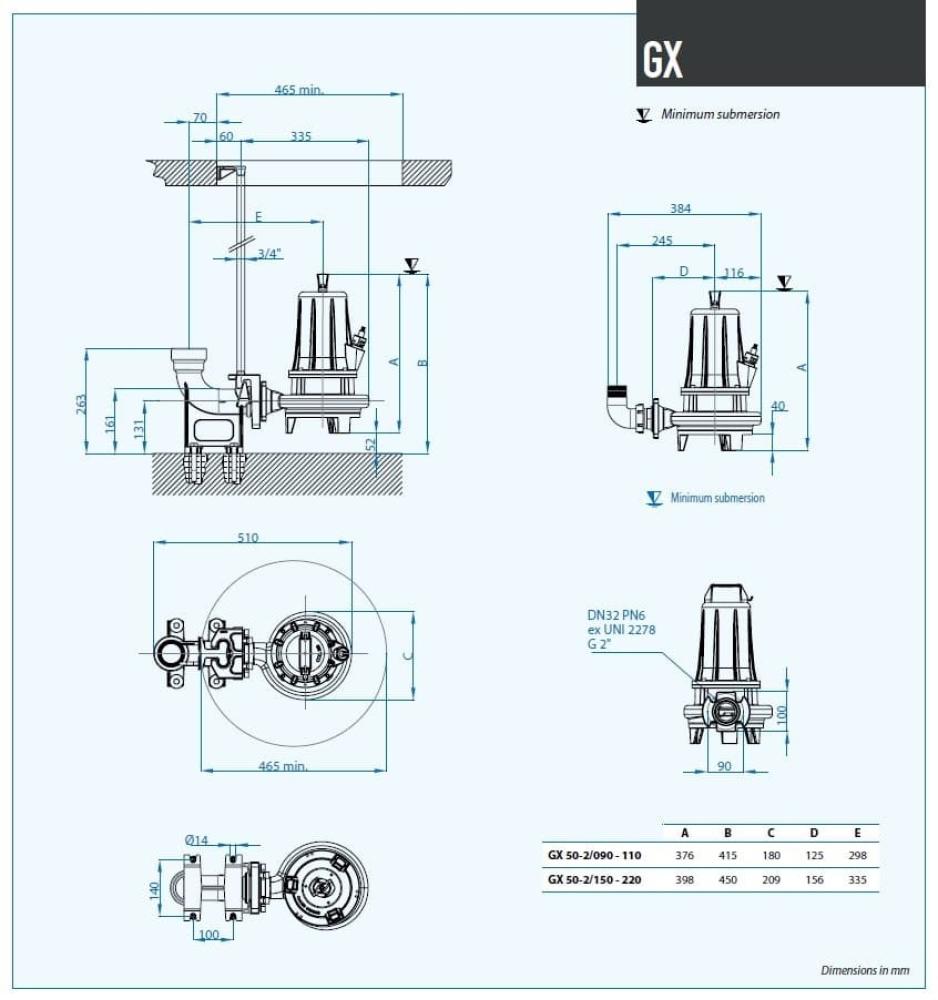 - механическое уплотнение. Диапазон двигателей: двигатель с короткозамкнутым ротором в исполнении с 2 полюсами; тепловая защита T1 и T2, встроенная в обмотку двигателя (подключается к трехполюсному контактору на панели управления); изоляция класса F (155°C); степень защиты IP68. Охлаждение двигателя: охлаждение двигателя обеспечивается жидкостью, в которую погружен насос. Пределы использования: максимально допустимая температура жидкости: 40°C при полностью погруженном насосе; по запросу, специальная версия (за исключением ATEX) для выдерживания температуры жидкости до 60°C с полностью погруженным насосом, без обслуживания S1; максимальная глубина погружения: 20 м; допустимое значение рН: 6-10; гидравлические характеристики, пригодные для жидкостей с плотностью <1,1 кг/дм3; допустимое напряжение: 220V/380V ±5%; допустимая частота: 50 Гц ±2%. Условные обозначения: G