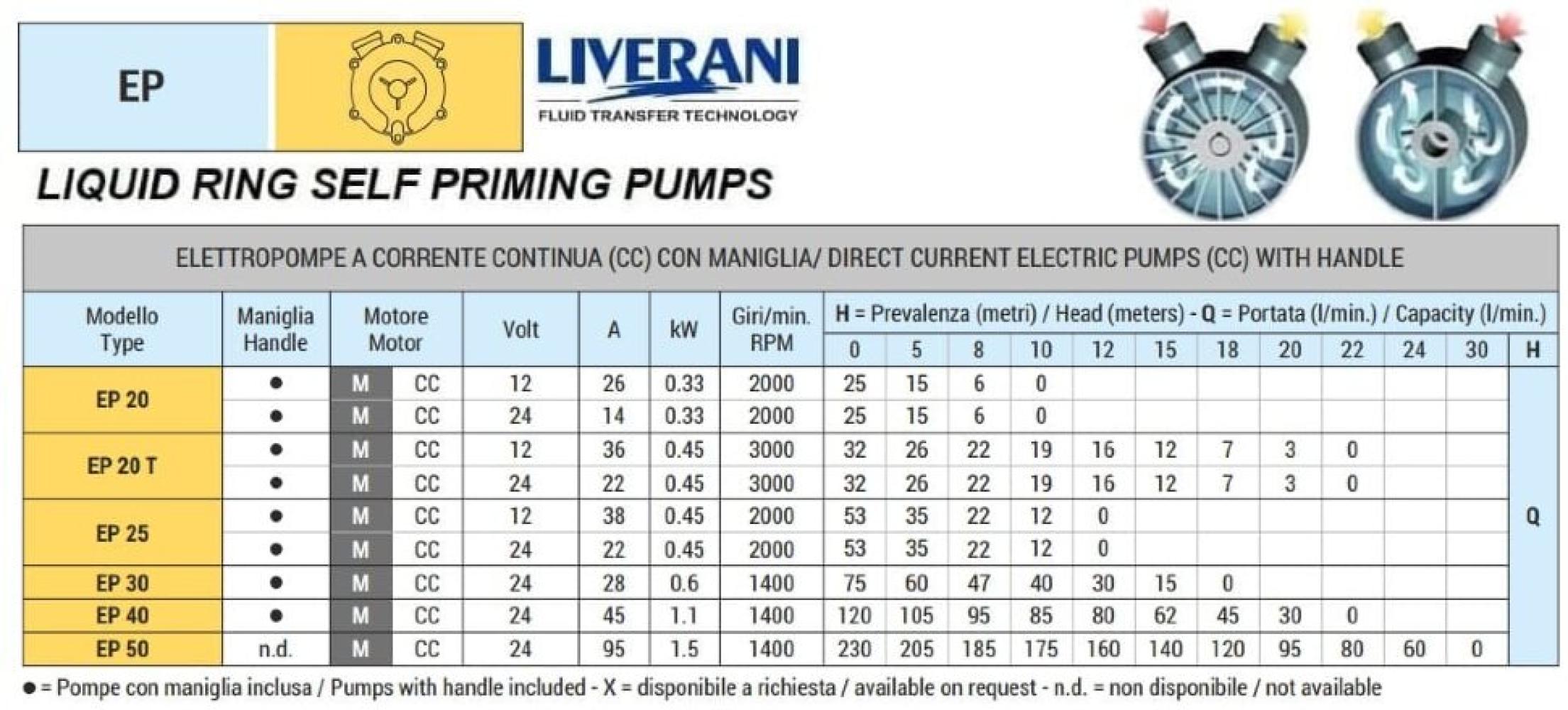 Жидкостные кольцевые насосы, реверсивные, пригодны для перекачки чистых жидкостей без твердых частиц с максимальной вязкостью 100 сП. Насосы доступны как из нержавеющей стали AISI 316, так и из бронзы. В зависимости от материала изготовления насосы находят широкое применение в различных отраслях: виноделии и пищевой промышленности (вино, сусло, уксус, масло, фруктовые соки, пиво, сиропы и рассол), молочной промышленности (молоко, сыворотка и т.п.), химическая промышленность (кислоты, растворители, фотографические жидкости, средства для (антикриптогамные средства, жидкие удобрения, газойль и т.п.), судоходство (морская вода, пресная вода, газойль и т.п.).