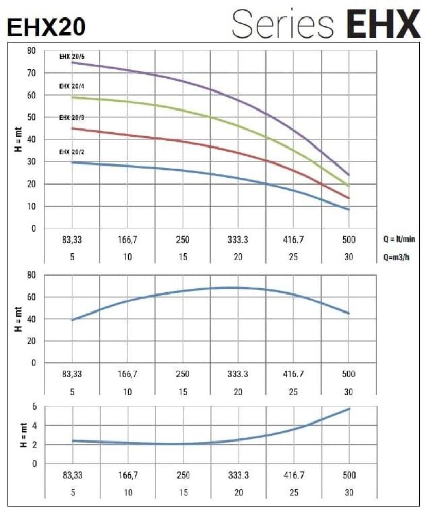Горизонтальные многоступенчатые насосы серии EHX полностью изготовлены из нержавеющей стали, подходят для бытового, сельскохозяйственного и промышленного применения. Все детали, контактирующие с перекачиваемой жидкостью изготовлены из нержавеющей стали AISI 304 для обеспечения максимальной гигиеничности и стойкости к коррозии. Корпус насоса, рабочее колесо, диффузор, вал: нержавеющая сталь AISI 304. Механическое уплотнение: Car/Cer/EPDM. Кронштейн и корпус мотора: алюминий.