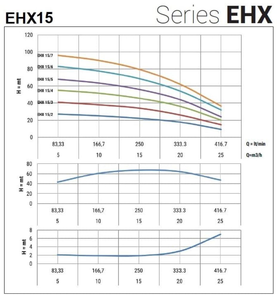 Горизонтальные многоступенчатые насосы серии EHX полностью изготовлены из нержавеющей стали, подходят для бытового, сельскохозяйственного и промышленного применения. Все детали, контактирующие с перекачиваемой жидкостью изготовлены из нержавеющей стали AISI 304 для обеспечения максимальной гигиеничности и стойкости к коррозии. Корпус насоса, рабочее колесо, диффузор, вал: нержавеющая сталь AISI 304. Механическое уплотнение: Car/Cer/EPDM. Кронштейн и корпус мотора: алюминий.