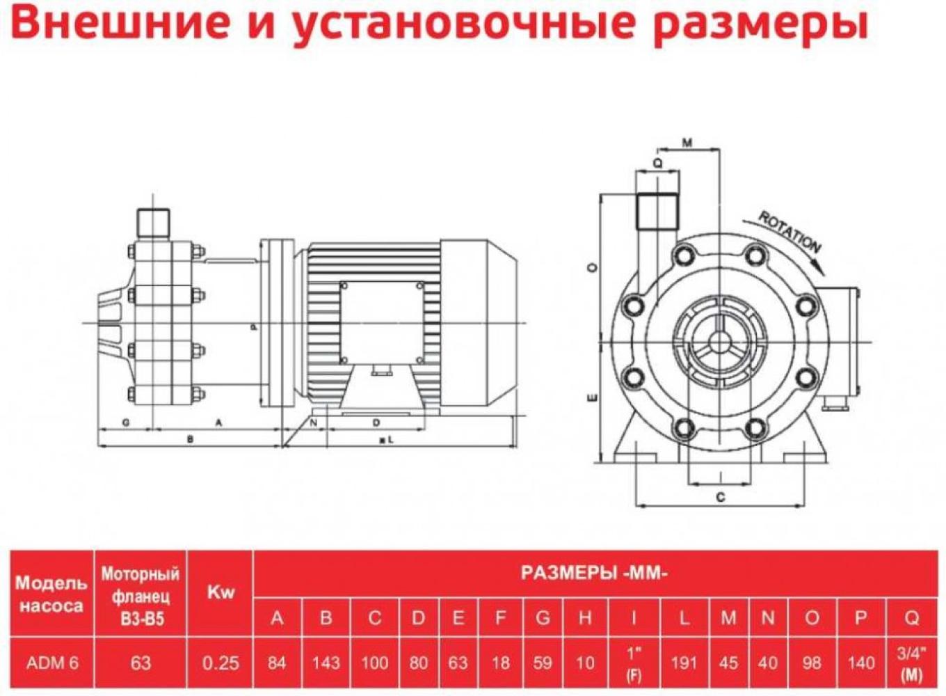 - нет потребности в техническом обслуживании Области применения: химическая, нефтехимическая, фармацевтическая, бумажная, текстильная, пищевая промышленности, сахарные заводы, молочные заводы, электроника, водоочистные сооружения, любые опасные химические жидкости. Технические характеристики насоса: Материал исполнения: PP Max. Производительность: 8,5 м3/час Макс. высота напора: 8,5 м.вод.ст Max.температура: 60°C Максимальная вязкость: 200 сПз Всасывающий / нагнетательный патрубки: DN1" х DN3/4" Мощность: 0,25 кВт, 3х380 V, 50 Hz, 3000 об/мин.
