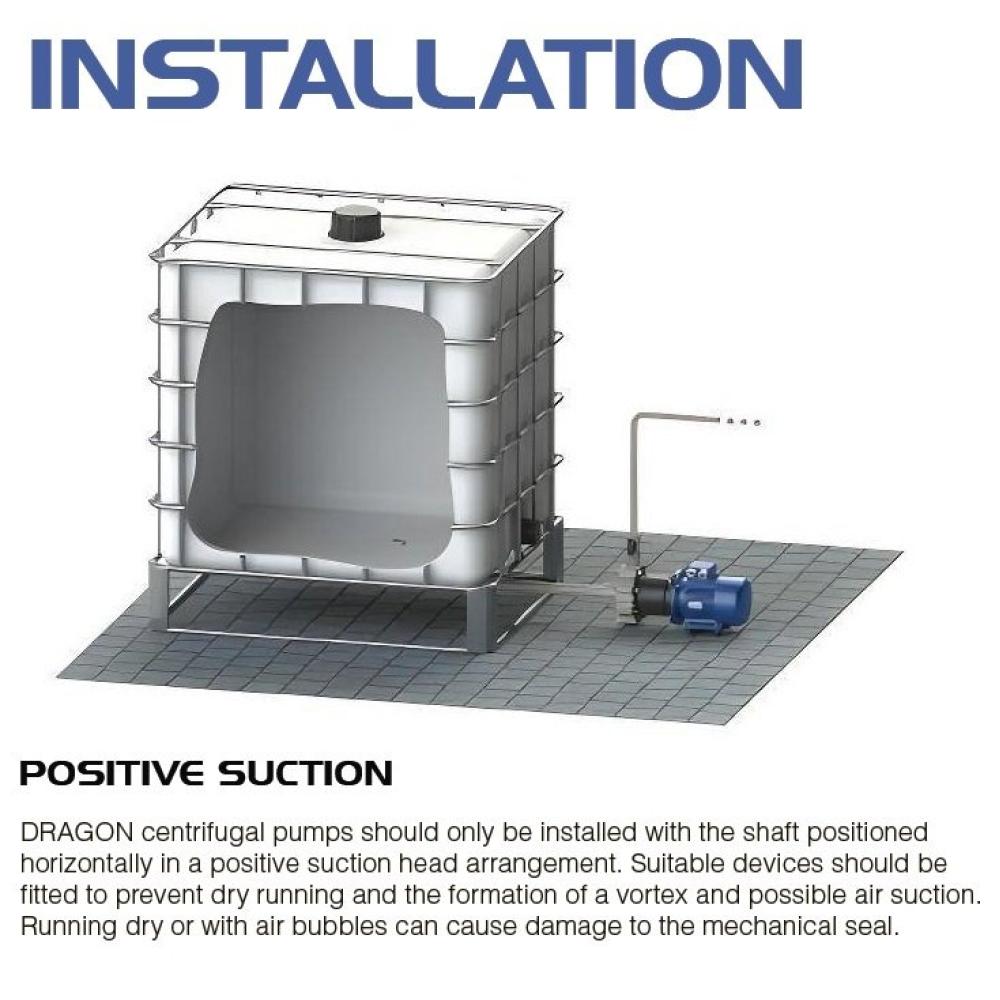 Химические центробежные пластиковые насосы серии DRAGON итальянской компании FLUIMAC – это высокопроизводительные насосы, приводимые в действие электродвигателем с прямым приводом для быстрой перекачки и отвода жидкости с расходом от 6 до 40 м3/час. Специальная полуоткрытая конструкция рабочего колеса позволяет непрерывно перекачивать даже грязную жидкость с относительной вязкостью до 500 cps. и мелкие взвешенные жесткие частицы. Центробежные насосы DRAGON имеют прочный корпус насоса и смотровое отверстие для подключения электродвигателя и проверки механического уплотнения. Полуоткрытое рабочее колесо установлено на валу насоса, соединенного с приводным валом электродвигателя. Механическое уплотнение вала расположено в задней части рабочего колеса. Механическое уплотнение DRAGON сконструировано с сильфоном из 100% чистого ПТФЭ для экстремально устойчивых к коррозии применений. Весь уплотнительный узел и его компоненты имеют механический привод для предотвращения проскальзывания на валу или втулке. Узел уплотнения устанавливается снаружи и находится под внутренним давлением. Центробежные насосы DRAGON следует устанавливать только с горизонтальным расположением вала при положительном напоре всасывания. Необходимо установить соответствующие устройства для предотвращения работы вхолостую, образования вихрей и возможного подсоса воздуха. Работа вхолостую или с пузырьками воздуха может привести к повреждению механического уплотнения.