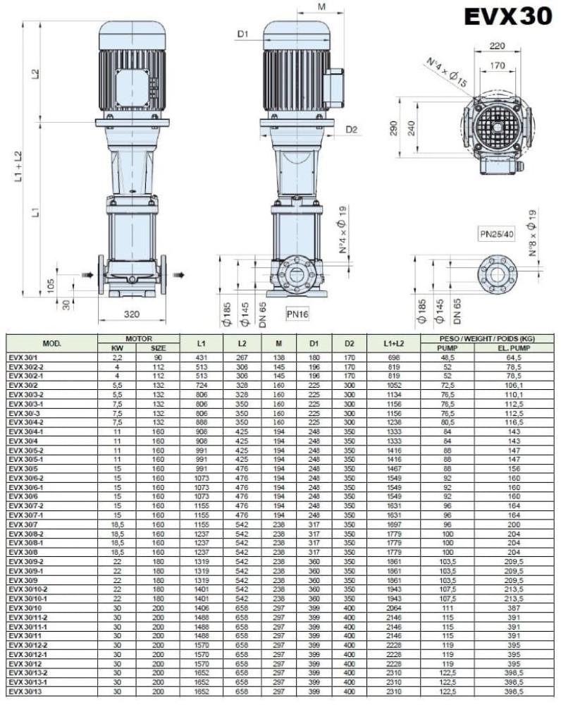 Вертикальные многоступенчатые насосы серии EVX пригодны для различных применений, преимущественно в промышленности и строительстве (питание котлов, циркуляция горячей и холодной воды для систем отопления/охлаждения/кондиционирования, установки для повышения давления и водоснабжения, моющие установки, водоочистные сооружения и т.д.). Все части насоса, контактирующие с жидкостью, изготовлены из нержавеющей стали AISI 304 (AISI 316 по заказу). Профессиональные вертикальные многоступенчатые насосы имеют простой монтаж в линию (инлайн), а также легкий демонтаж и техническое обслуживание.