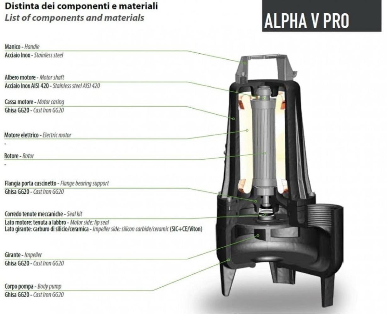 Насос для стоков Dreno Alpha V PRO. Насос для сточных вод Dreno Pompe производство Италия характеризуется длительным сроком службы, производительностью и надежностью. Канализационные погружные дренажные насосы от итальянской торговой марки Dreno Pompe используется для перекачки бытовых и промышленных сточных вод. Область применения достаточно большая: жилой сектор (частные дома), сельскохозяйственные комплексы, животноводческие фермы-насосы для навозохранилищ и лагун, мелкое производство, промышленные стоки, общественные учреждения-насосы для канализации и водоотведения паводковых вод. Также оборудование подходит для работы во взрывоопасной среде, для перекачки воды с содержанием нефтепродуктов и других взрывоопасных жидкостей. В подтверждение этого насосы многих серий с разрешительным сертификат ATEX.