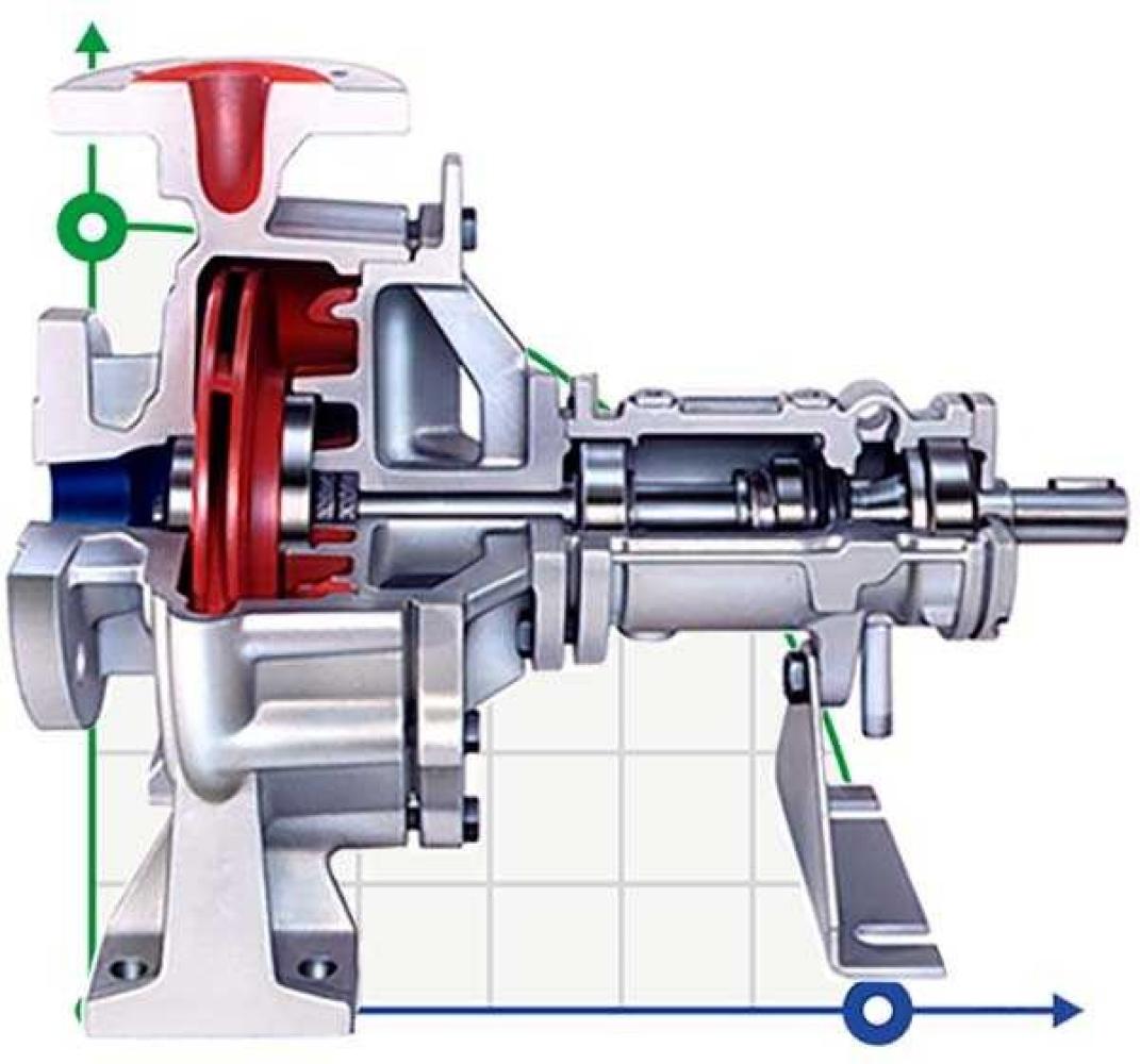 - или двухступенчатое, механическое уплотнение вала, эффективное самоохлаждение. Выходной патрубок направлен радиально вверх, всасывающий