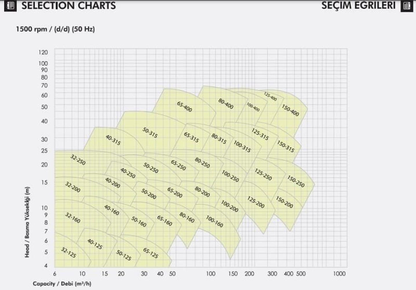 Размеры насоса соответствуют стандарту TS EN 733. Фланцы всасывания и нагнетания соответствуют стандарту ISO 7005-2/PN 16. Уплотнение рабочей камеры обеспечивается механическим уплотнением. Используется закрытое рабочее колесо. Применение: сельскохозяйственное орошение и дождевание; системы отопления и охлаждения; системы пожаротушения; для дренажа, и другое промышленное назначение. Технические данные: нагнетательный фланец: DN32 ... DN150.