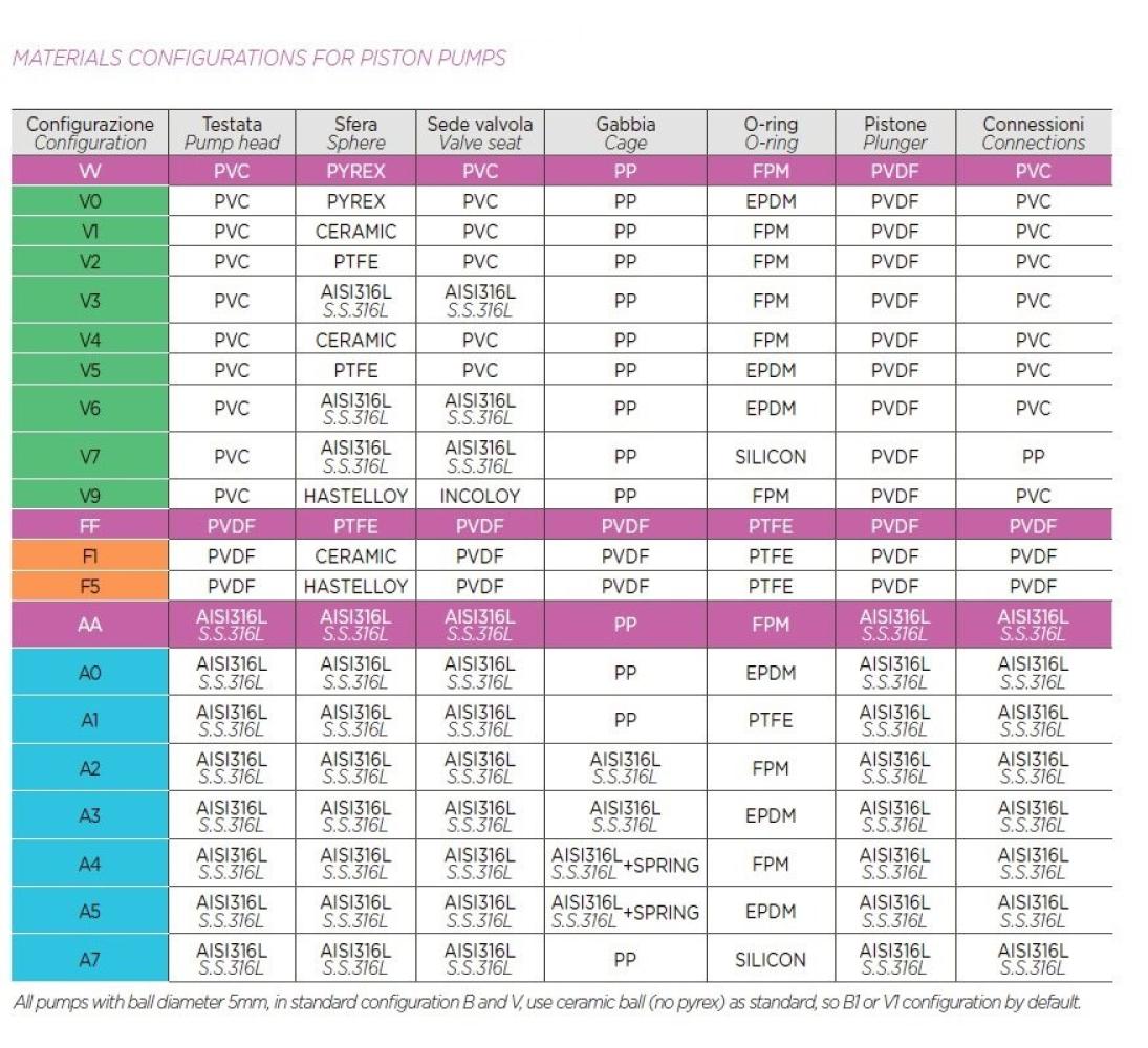 - 100% регулировка во время работы или остановки. Насосы могут быть выполнены в следующих материалах: Головка насоса из PVC (ПВХ) идеально подходит для: серная кислота, PAC, гидроксид натрия, хлорид алюминия, моющие средства, перекись водорода, кислые и нейтральные химические продукты. Головка насоса из PVDF (ПВДФ, поливинилиденфторид) идеально подходит для: фториды, хром, гипохлорит натрия, нейтральные химические продукты, кислые и сильнокислые химические продукты. Насосная головка из нержавеющей стали AISI 316L идеально подходит для: пищевая промышленность и производство напитков, уксусная кислота, полиэлектролит, азотная кислота, щелочные и нейтральные химические продукты.