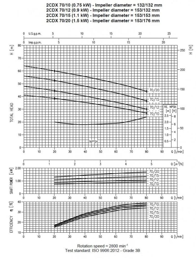Технические данные: производительность до 14,4 м3/ч; высота подачи до 75 м; T.E.F.C. 2 полюсный двигатель; класс изоляции F; степень защиты IP 55; однофазные 220V, 50 Hz, трехфазные 380V, 50 Hz; встроенный конденсатор и автоматическая защита от тепловой перегрузки для однофазной версии. Для трехфазной версии защиту от тепловой перегрузки должен обеспечить потребитель. Входной патрубок 1 "1/2 для2CDX200, 1" 1/4 для других моделей. Выходной патрубок 1"