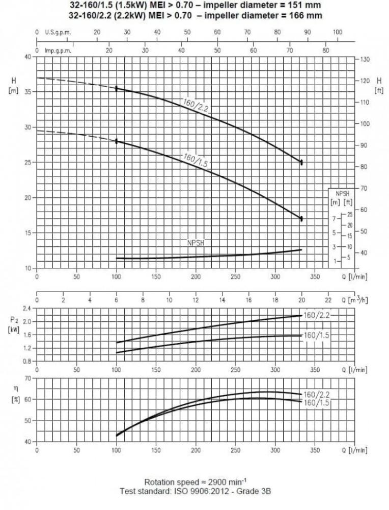 - 3P). Специальные двигатели: взрывобезопасные, высокоэффективные EFF 1, низкошумные, с интегрированным инвертором VMA. На заказ устанавливается механическое уплотнение, что удовлетворит ваши потребности. Спецификация: производительность до 132 м3/час. Высота подачи до 72 м. Максимальное давление: 1 МПа. Температура перекачиваемой жидкости: -10°C ÷ 100°C. по стандарту, -10°C ÷ 110°C для версии Н. Корпус насоса, крышка корпуса, рабочее колесо и вал из нержавеющей стали AISI 304 (серия 3), с AISI 316L (серия 3L). Механическое уплотнение из графита/керамики/NBR для стандартной версии (серия 3), из SiC/SiC/FPM (серия 3L), механическое уплотнение из графита/керамики/FPM для версии Н, механическое уплотнение из SiC/SiC/FPM для версии HS, механическое уплотнение из SiC/графита/FPM для версии Е. Технические данные: асинхронный 2-х и 4-х полюсный двигатель. Класс изоляции F . Степень защиты IP55. Однофазные 220V, 50 Гц, трехфазные 380V, 50 Гц. Защиту от тепловой перегрузки должен обеспечить потребитель.