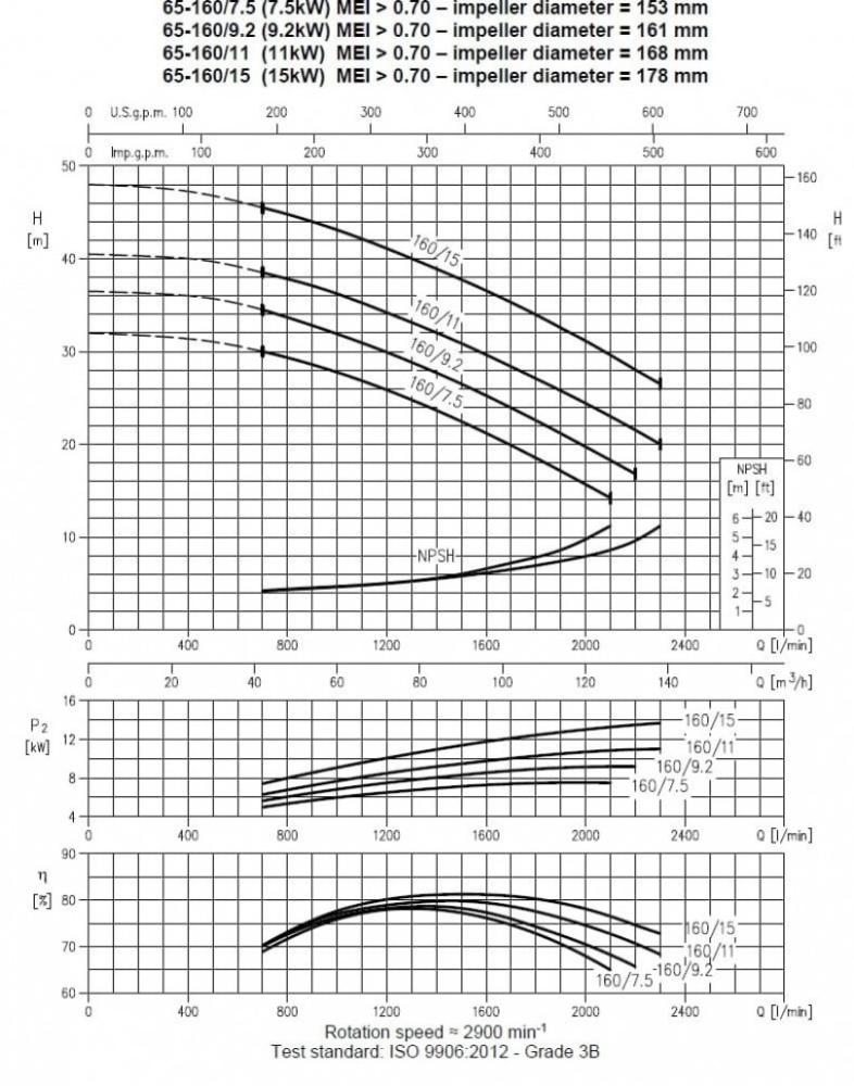 - 3P). Специальные двигатели: взрывобезопасные, высокоэффективные EFF 1, низкошумные, с интегрированным инвертором VMA. На заказ устанавливается механическое уплотнение, что удовлетворит ваши потребности. Спецификация: производительность до 132 м3/час. Высота подачи до 72 м. Максимальное давление: 1 МПа. Температура перекачиваемой жидкости: -10°C ÷ 100°C. по стандарту, -10°C ÷ 110°C для версии Н. Корпус насоса, крышка корпуса, рабочее колесо и вал из нержавеющей стали AISI 304 (серия 3), с AISI 316L (серия 3L). Механическое уплотнение из графита/керамики/NBR для стандартной версии (серия 3), из SiC/SiC/FPM (серия 3L), механическое уплотнение из графита/керамики/FPM для версии Н, механическое уплотнение из SiC/SiC/FPM для версии HS, механическое уплотнение из SiC/графита/FPM для версии Е. Технические данные: асинхронный 2-х и 4-х полюсный двигатель. Класс изоляции F . Степень защиты IP55. Однофазные 220V, 50 Гц, трехфазные 380V, 50 Гц. Защиту от тепловой перегрузки должен обеспечить потребитель.