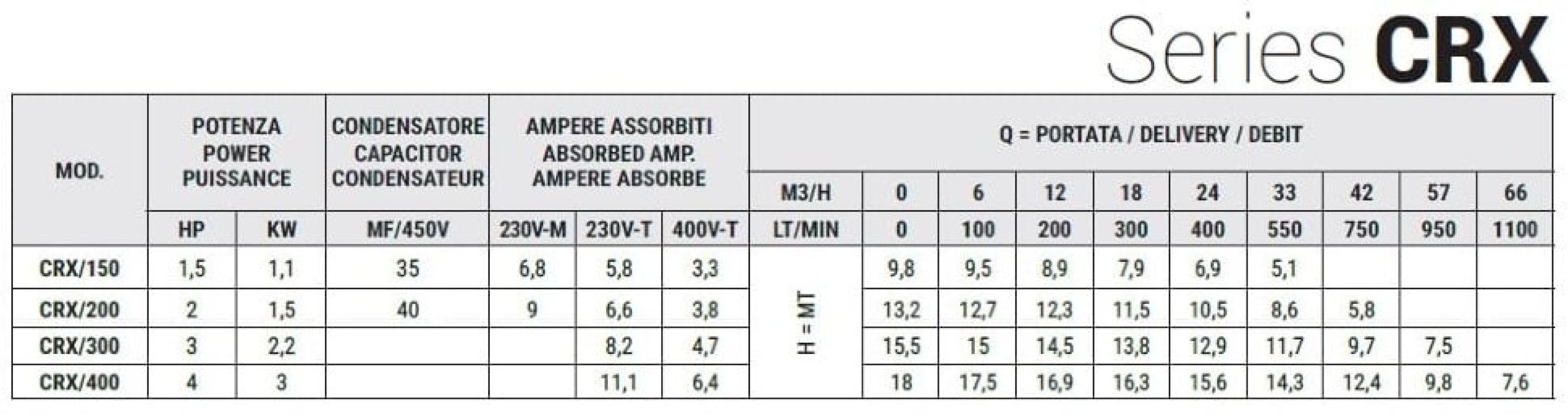 Насосы с открытым рабочим колесом серии CRX полностью изготовлены из нержавеющей стали, подходят для бытового, сельскохозяйственного и промышленного применения. Все детали, контактирующие с перекачиваемой жидкостью изготовлены из нержавеющей стали AISI 304 для обеспечения максимальной гигиеничности и стойкости к коррозии. Открытое рабочее колесо позволяет перекачивать чистую или относительно грязную воду с жесткими частями диаметром не более 8 мм. Корпус насоса, рабочее колесо, диффузоры: нержавеющая сталь AISI 304. Вал двигателя: нержавеющая сталь AISI 303. Корпус и кожух двигателя: алюминий. Механическое уплотнение Cer/Car/NBR.