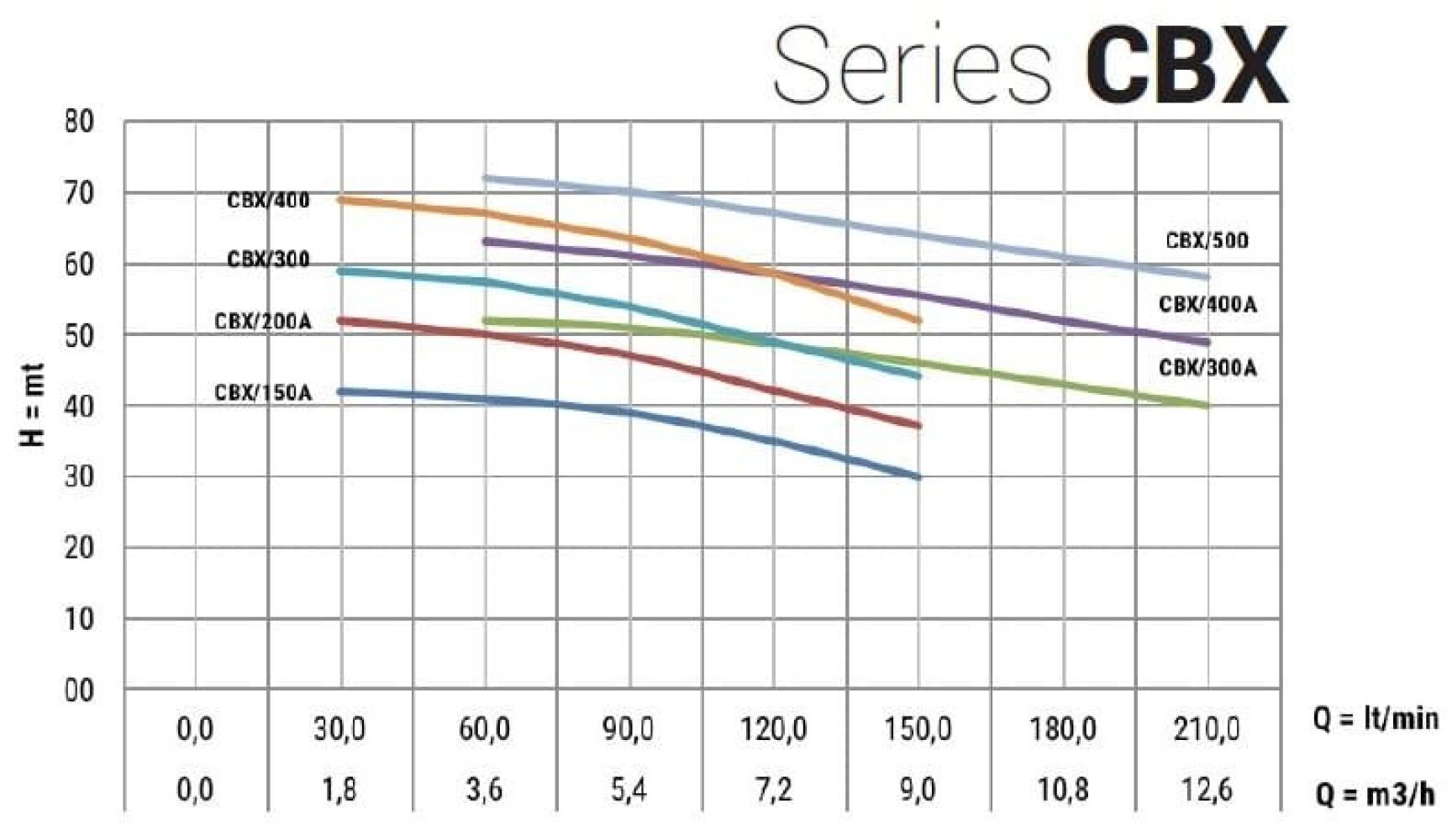 Центробежные насосы серии CBX с двумя рабочими колесами, полностью изготовленные из нержавеющей стали, подходят для бытового, сельскохозяйственного и промышленного применения. Все детали, контактирующие с перекачиваемой жидкостью изготовлены из нержавеющей стали AISI 304 для обеспечения максимальной гигиеничности и стойкости к коррозии. Корпус насоса, рабочее колесо, диффузор: нержавеющая сталь AISI 304. Вал двигателя: нержавеющая сталь AISI 303. Кронштейн и корпус двигателя: алюминий. Механическое уплотнение Cer/Car/NBR.