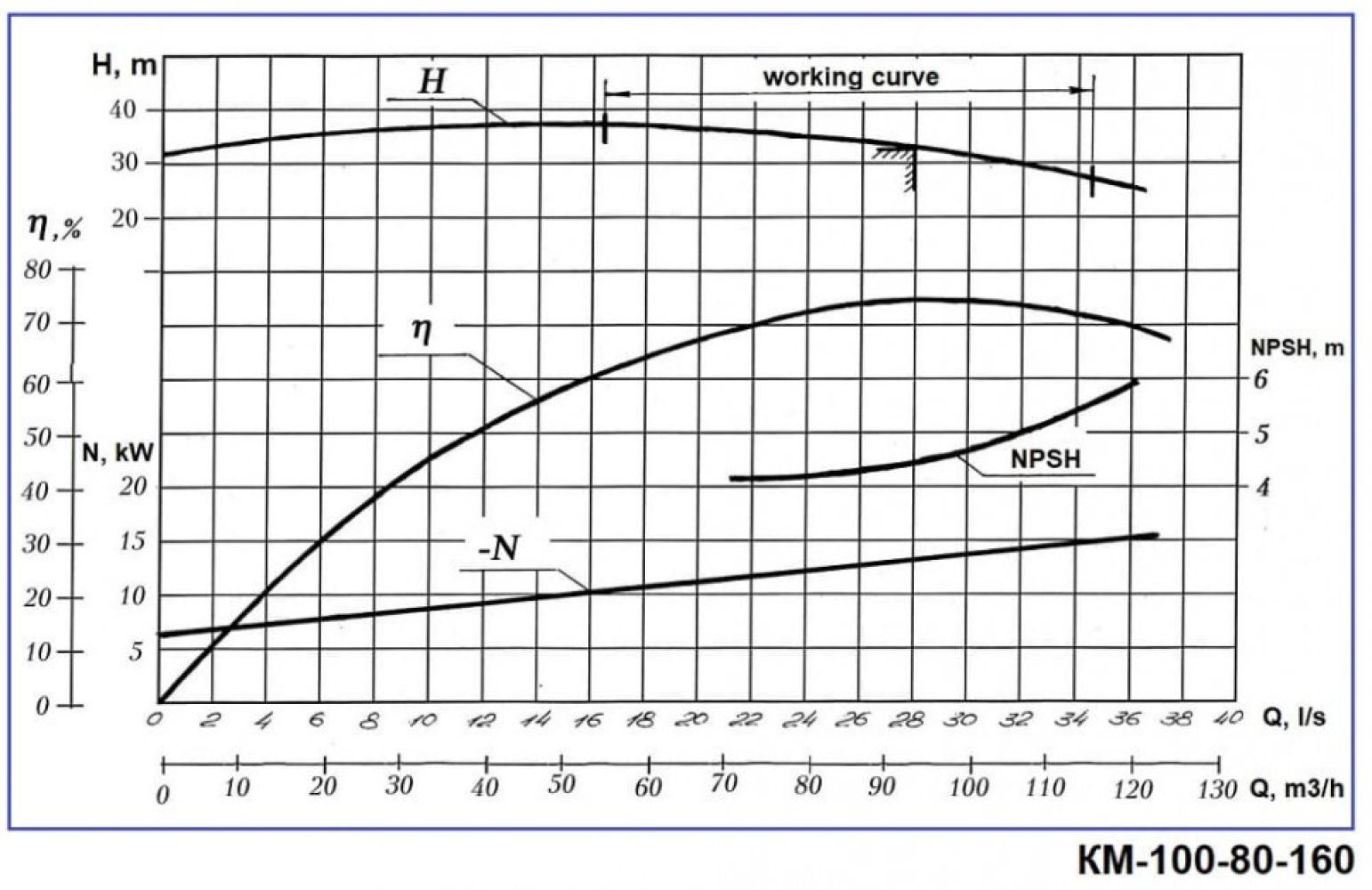 Консольные центробежные насосы типа КM предназначены для перекачки чистой воды (кроме морской) с pH 6…9 и других подобных чистой воде жидкостей по плотности, вязкости и химической активности. Работают в стационарных условиях с температурой в диапазоне от 0 до +85°С. Перекачиваемые жидкости не должны содержать механических примесей по объему более 0,1% и размеру более 0,2 мм. Уплотнение вала насосов – одинарный сальник. Материал деталей проточной части – серый чугун. По специальному заказу агрегаты производятся с двойным сальниковым уплотнением (СД) для перекачки жидкости с температурой до плюс 105°С и торцевым уплотнением (Т).