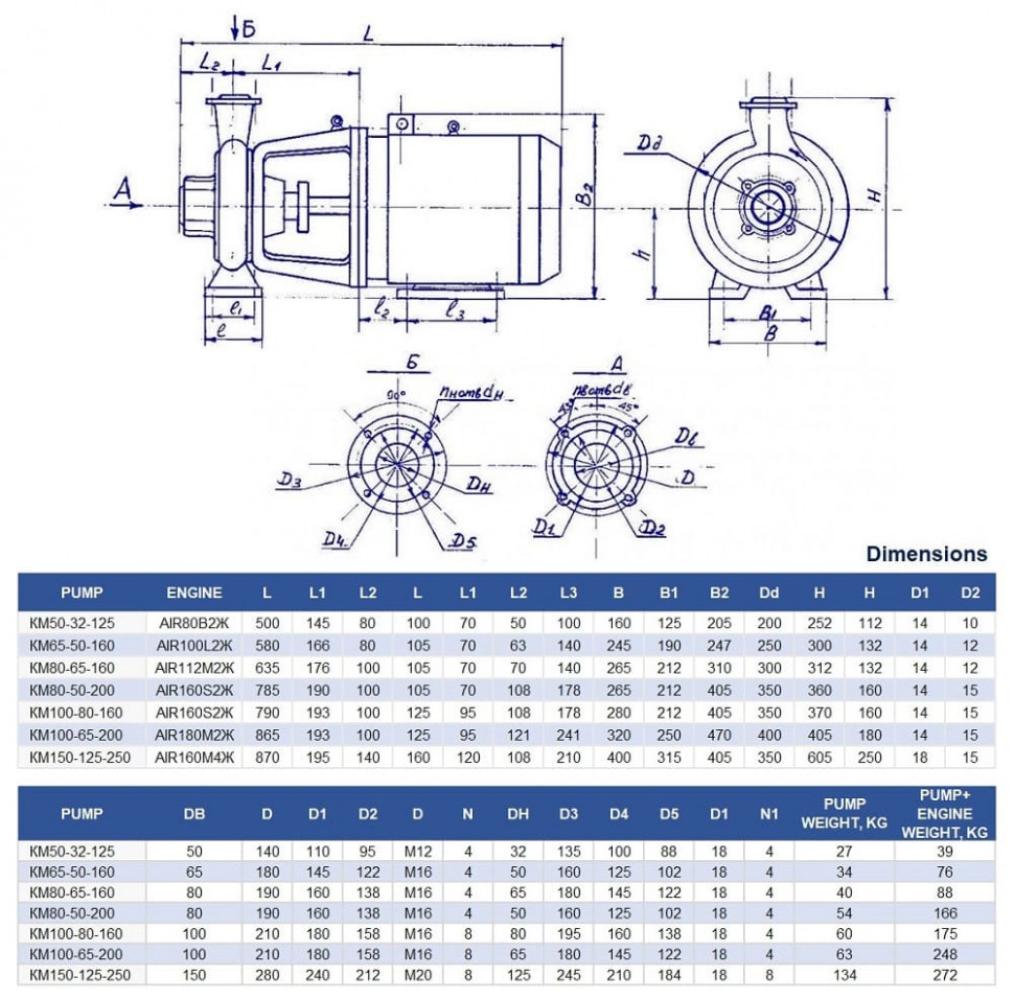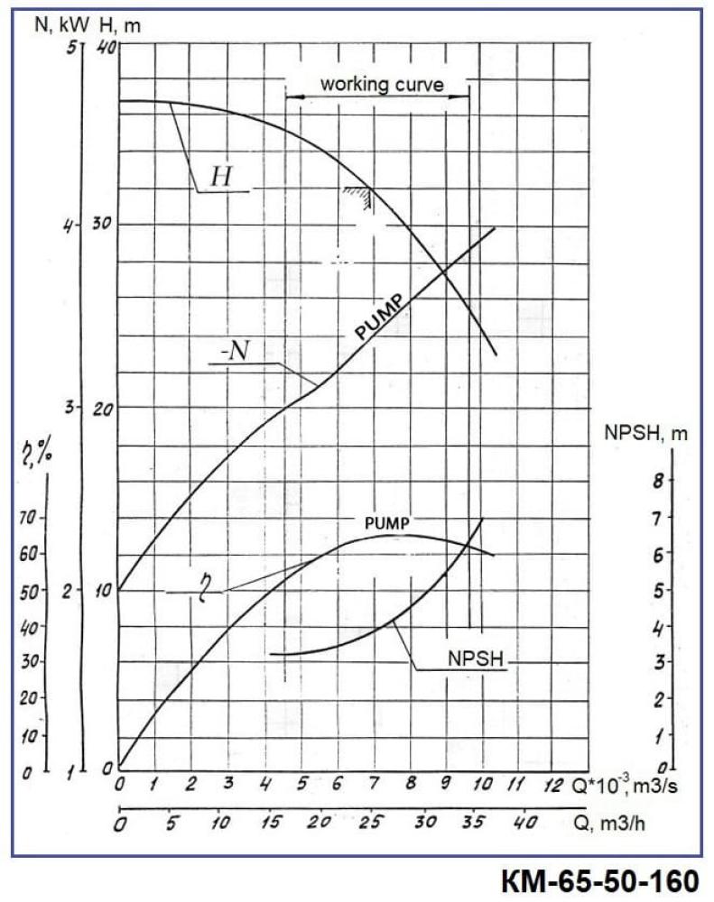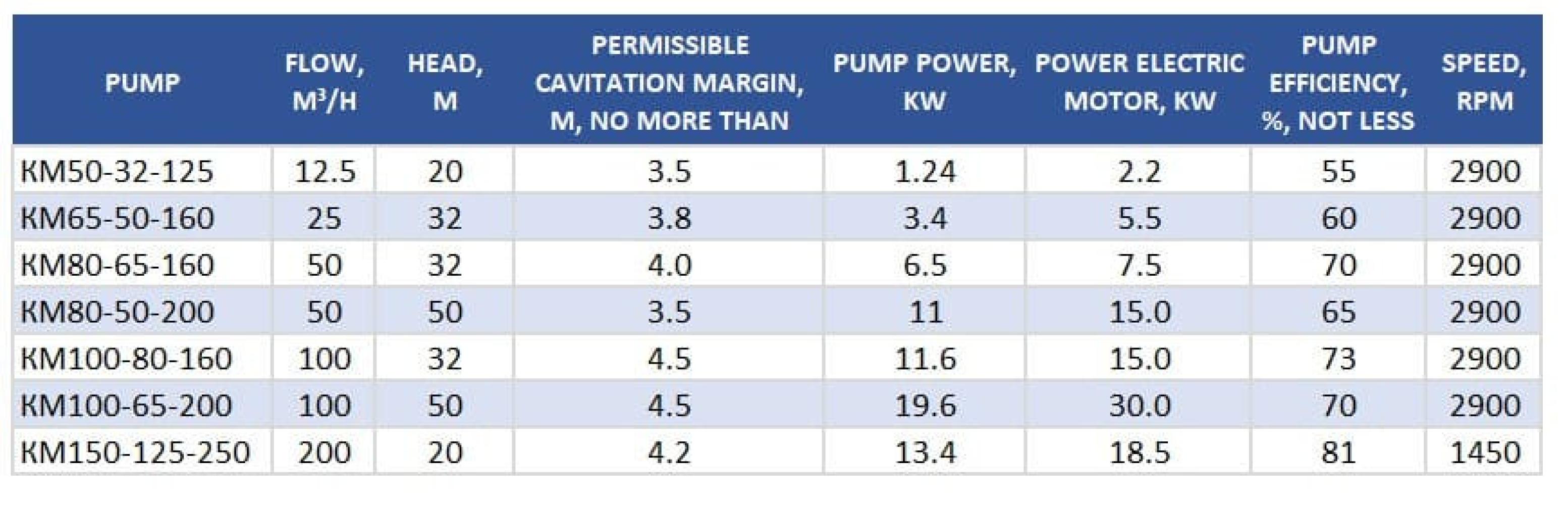 Консольные центробежные насосы типа КM предназначены для перекачки чистой воды (кроме морской) с pH 6…9 и других подобных чистой воде жидкостей по плотности, вязкости и химической активности. Работают в стационарных условиях с температурой в диапазоне от 0 до +85°С. Перекачиваемые жидкости не должны содержать механических примесей по объему более 0,1% и размеру более 0,2 мм. Уплотнение вала насосов – одинарный сальник. Материал деталей проточной части – серый чугун. По специальному заказу агрегаты производятся с двойным сальниковым уплотнением (СД) для перекачки жидкости с температурой до плюс 105°С и торцевым уплотнением (Т).