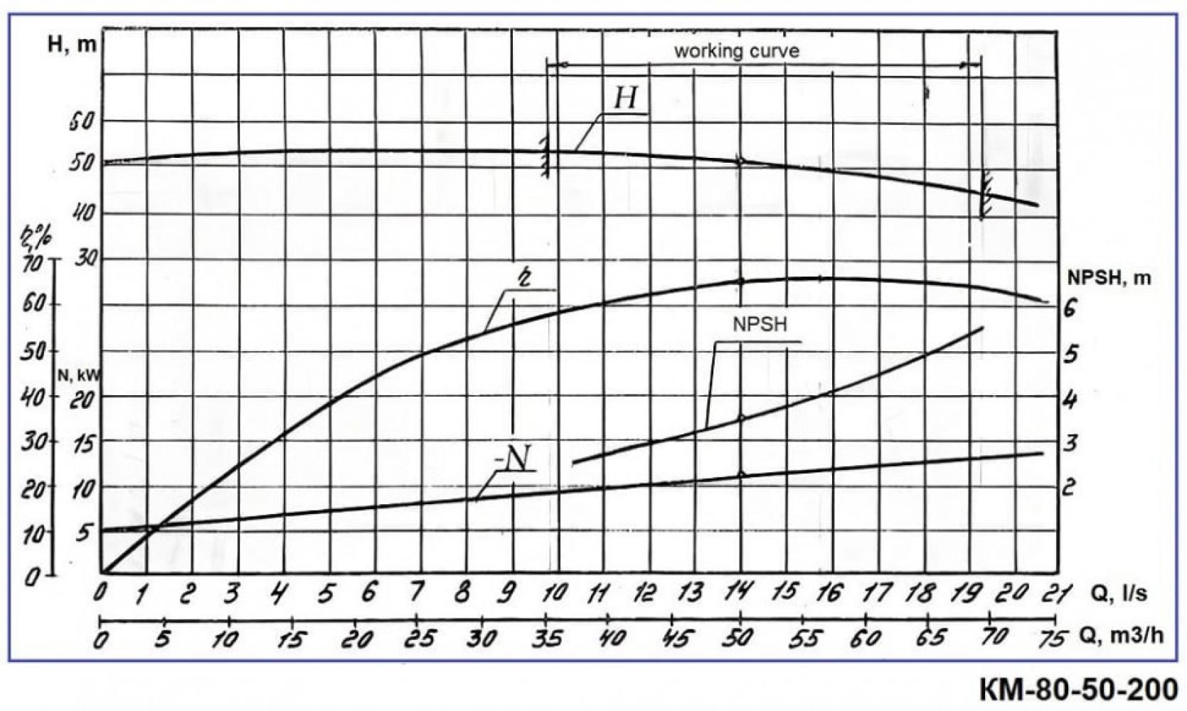 Консольные центробежные насосы типа КM предназначены для перекачки чистой воды (кроме морской) с pH 6…9 и других подобных чистой воде жидкостей по плотности, вязкости и химической активности. Работают в стационарных условиях с температурой в диапазоне от 0 до +85°С. Перекачиваемые жидкости не должны содержать механических примесей по объему более 0,1% и размеру более 0,2 мм. Уплотнение вала насосов – одинарный сальник. Материал деталей проточной части – серый чугун. По специальному заказу агрегаты производятся с двойным сальниковым уплотнением (СД) для перекачки жидкости с температурой до плюс 105°С и торцевым уплотнением (Т).