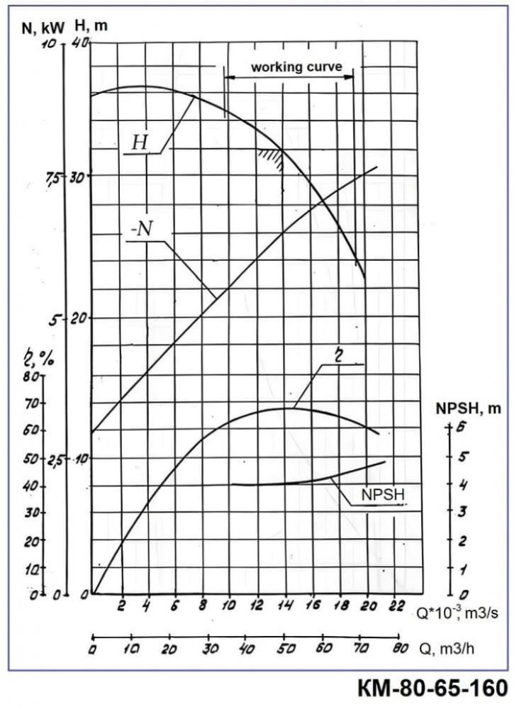 Консольные центробежные насосы типа КM предназначены для перекачки чистой воды (кроме морской) с pH 6…9 и других подобных чистой воде жидкостей по плотности, вязкости и химической активности. Работают в стационарных условиях с температурой в диапазоне от 0 до +85°С. Перекачиваемые жидкости не должны содержать механических примесей по объему более 0,1% и размеру более 0,2 мм. Уплотнение вала насосов – одинарный сальник. Материал деталей проточной части – серый чугун. По специальному заказу агрегаты производятся с двойным сальниковым уплотнением (СД) для перекачки жидкости с температурой до плюс 105°С и торцевым уплотнением (Т).