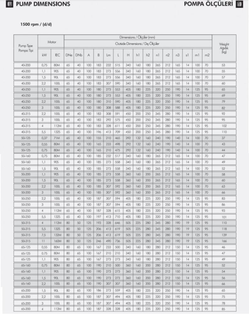 Размеры насоса соответствуют стандарту TS EN 733. Фланцы всасывания и нагнетания соответствуют стандарту ISO 7005-2/PN 16. Уплотнение рабочей камеры обеспечивается механическим уплотнением. Используется закрытое рабочее колесо. Применение: сельскохозяйственное орошение и дождевание; системы отопления и охлаждения; системы пожаротушения; для дренажа, и другое промышленное назначение. Технические данные: нагнетательный фланец: DN32 ... DN150.