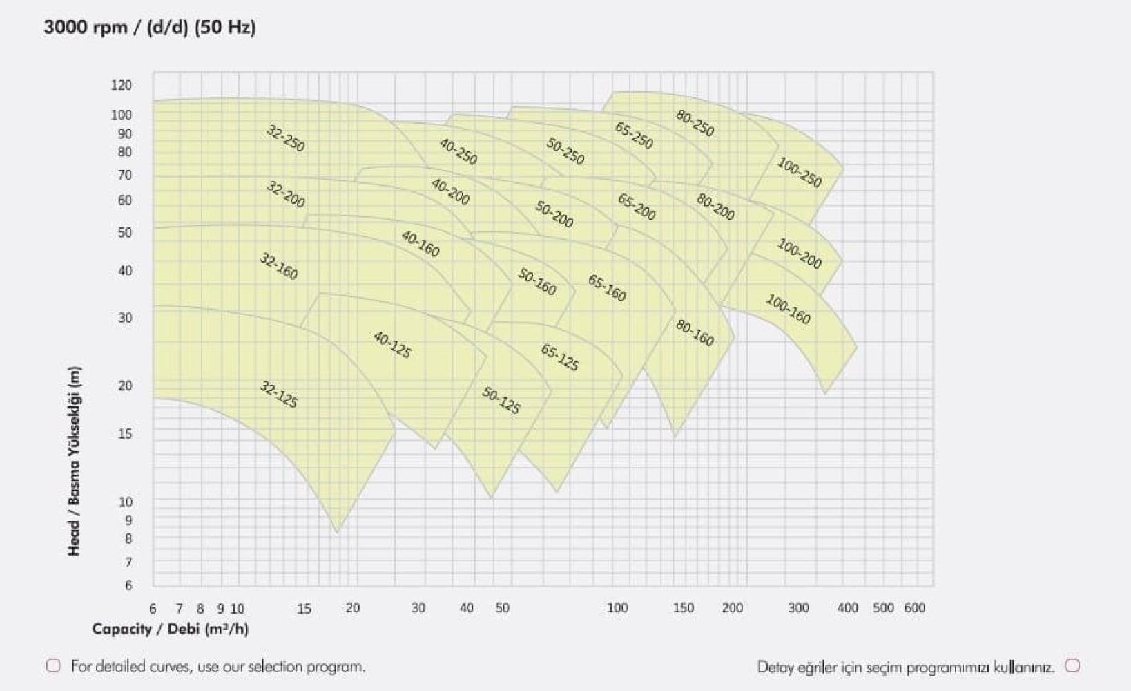 Размеры насоса соответствуют стандарту TS EN 733. Фланцы всасывания и нагнетания соответствуют стандарту ISO 7005-2/PN 16. Уплотнение рабочей камеры обеспечивается механическим уплотнением. Используется закрытое рабочее колесо. Применение: сельскохозяйственное орошение и дождевание; системы отопления и охлаждения; системы пожаротушения; для дренажа, и другое промышленное назначение. Технические данные: нагнетательный фланец: DN32 ... DN150.