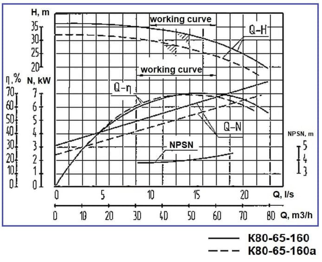 Консольные центробежные насосы типа К предназначены для перекачки чистой воды (кроме морской) с pH 6…9 и других подобных чистой воде жидкостей по плотности, вязкости и химической активности. Работают в стационарных условиях с температурой в диапазоне от 0 до +85°С. Перекачиваемые жидкости не должны содержать механических примесей по объему более 0,1% и размеру более 0,2 мм. Уплотнение вала насосов – одинарный сальник. Материал деталей проточной части – серый чугун. По специальному заказу агрегаты производятся с двойным сальниковым уплотнением (СД) для перекачки жидкости с температурой до плюс 105°С и торцевым уплотнением (Т).