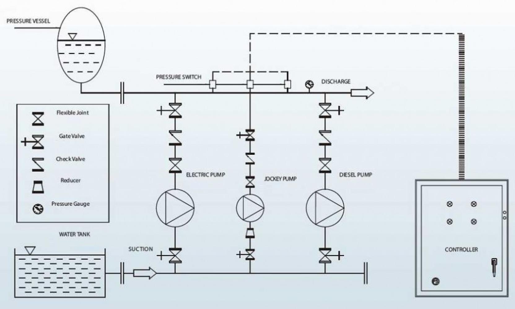 - Наличие жокей-насоса для поддержания давления в системе пожаротушения