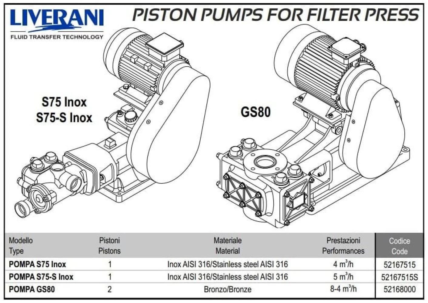 Насос двойного действия с одним поршнем POMPA S75-S особенно пригоден для перекачки под давлением остаточной воды из промышленных процессов или осадочных жидкостей. Особенности эксплуатации: ● Подача в фильтр-пресс промышленных сточных вод для очистки от иловых остатков. ● Подача осадка на фильтрацию в виноделии. ● Для любого типа фильтрации под давлением. Двигатель: M100, 4 полюса, Hp4 220/380 В, 50 Гц. Редукторная группа: кислотостойкий алюминиевый корпус с чугунными шестернями. Наружная ременная редукторная группа, от 1400 об/мин приводного шкива (Ø96) до 720 об/мин ведомого шкива (Ø190), с гибкой муфтой. Насосная часть: корпус насоса из нержавеющей стали AISI 316, цилиндр и штоки поршней из хромированной нержавеющей стали AISI 304, шаровые клапаны и седла клапанов из нержавеющей стали AISI 316, поршень, уплотнения и прокладки из материала, устойчивого к абразивному стойку.