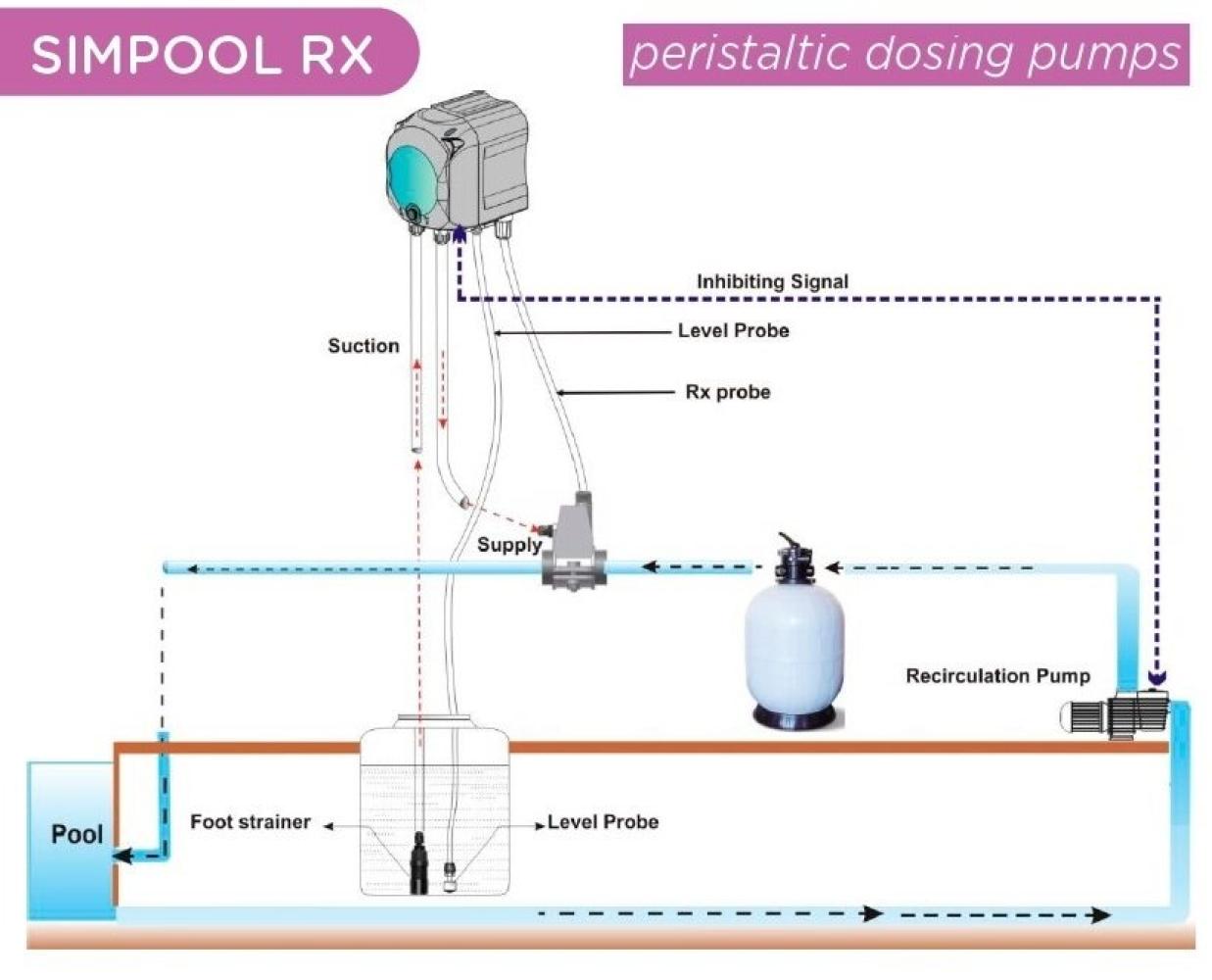 Цифровой перистальтический дозирующий насос AQUA SIMPOOL RX со встроенным Rx-метром. Идеально подходит для пропорциональной дозы хлора и других жидких дезинфицирующих средств для бассейна. Простой, точный и гибкий в использовании. Цифровой дисплей включен даже без циркуляционного потока, контроль наличия/отсутствия потока через подключение к рециркуляционному насосу (Inhibit), совместимый с датчиком уровня. В комплект входит: Rx-электрод, всасывающая/нагнетательная труба 4 м, буферный раствор 1 мВ для калибровки электрода, кронштейн для настенного крепления и дюбеля, хомут для держателя электрода 2в1 и впрыскивание продукта, подходящего для труб DN50-63 ADPS.
