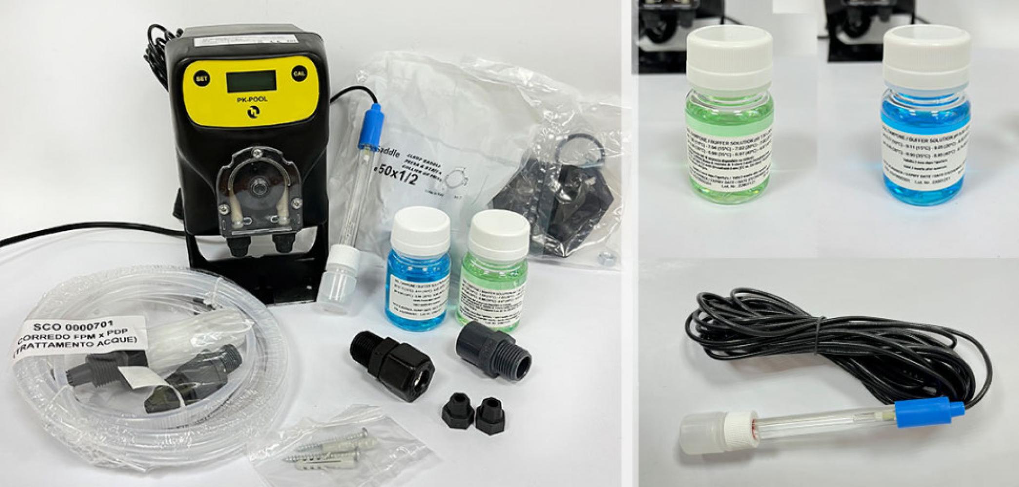 Комплект станции: датчик pH с 5 м кабелем, 2 седловых зажима, держатель датчика PP ½'', буферный раствор: pH 7 и 9, инжекционный клапан (PVC/FPM), нижний фильтр (PP/FPM), PVC 2м, всасывающей трубки и PE 2м, шланга подачи, кронштейн для крепления на ножку или стену