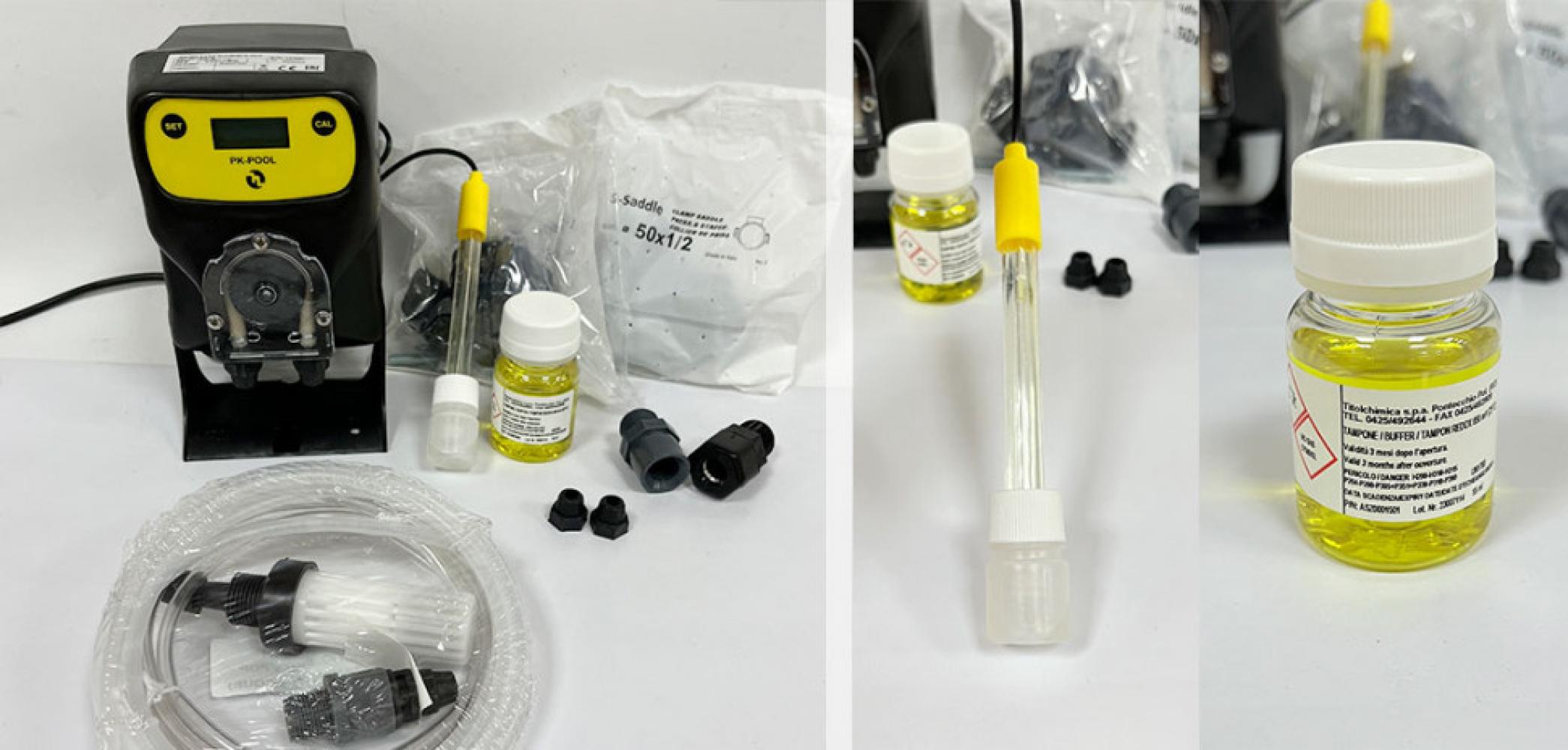Поставляется с монтажным комплектом: датчик Rx с 5 м кабелем, 2 седловых зажима, держатель датчика PP ½'', буферный раствор: 650 мВ, инжекционный клапан (PVC/FPM), нижний фильтр (PP/FPM), PVC 2м всасывающей трубки и PE 2м шланга подачи, кронштейн для крепления на ножку или стену.