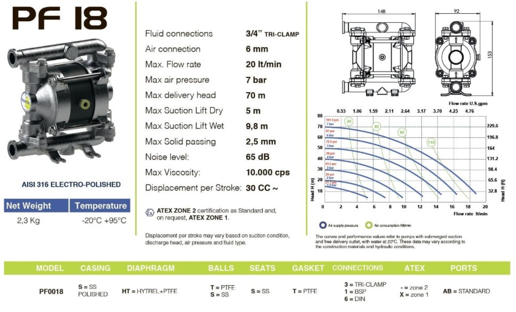 Пневматические двухмембранные насосы серии Phoenix FOOD изготовлены из конструкционных материалов, сертифицированных FDA.