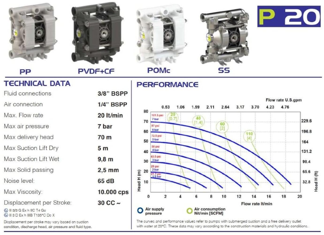 Проточна частина мембранних насосів PHOENIX виготовляється із таких матеріалів як PVDF, Alu, POMc, PP, AISI316. Основні робочі елементи (мембрани, шарикові клапани, клапанні сідла) виготовляються із PVDF, Alu, POMc, PP, AISI316, PTFE, NBR, PE, SANTOPRENE, HYTREL.