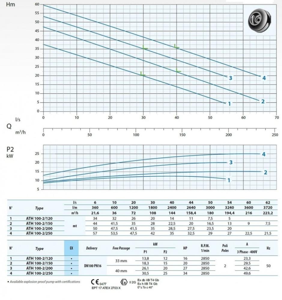 Пределы использования: максимально допустимая температура жидкости: 40°C при полностью погруженном насосе; по запросу, специальная версия (за исключением ATEX) для выдерживания температуры жидкости до 60°C с полностью погруженным насосом, без обслуживания S1; максимальная глубина погружения: 20 м; допустимое значение рН: 6-10; гидравлические характеристики, пригодные для жидкостей с плотностью <1,1 кг/дм3; допустимое напряжение: 380V ±5%; допустимая частота: 50 Гц ±2%.