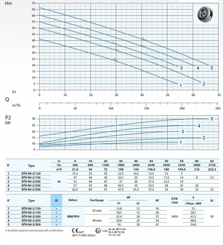 Пределы использования: максимально допустимая температура жидкости: 40°C при полностью погруженном насосе; по запросу, специальная версия (за исключением ATEX) для выдерживания температуры жидкости до 60°C с полностью погруженным насосом, без обслуживания S1; максимальная глубина погружения: 20 м; допустимое значение рН: 6-10; гидравлические характеристики, пригодные для жидкостей с плотностью <1,1 кг/дм3; допустимое напряжение: 380V ±5%; допустимая частота: 50 Гц ±2%.