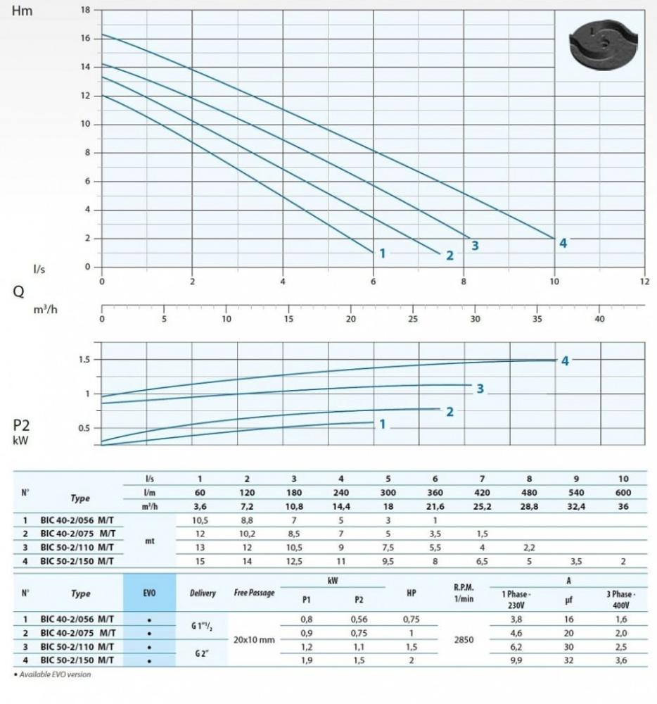 Диапазон двигателей: двигатель с короткозамкнутым ротором в исполнении с 2 полюсами; тепловая защита, встроенная в обмотку; только для BIC PRO и AM-AT 50/2/110, термозащита T1 и T2 встроенный в обмотку двигателя (подключается к трехполюсного контактора на панели управления); класс изоляции F 155°; степень защиты двигателя-IP68.