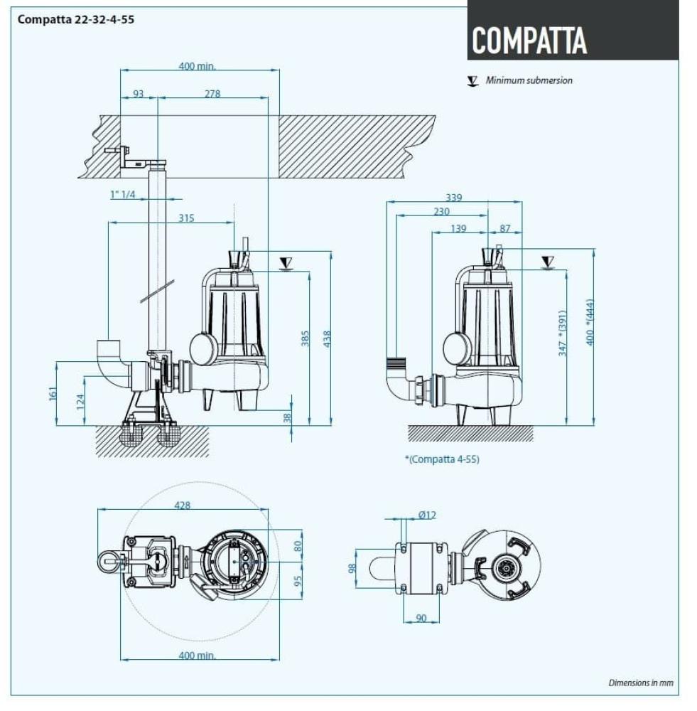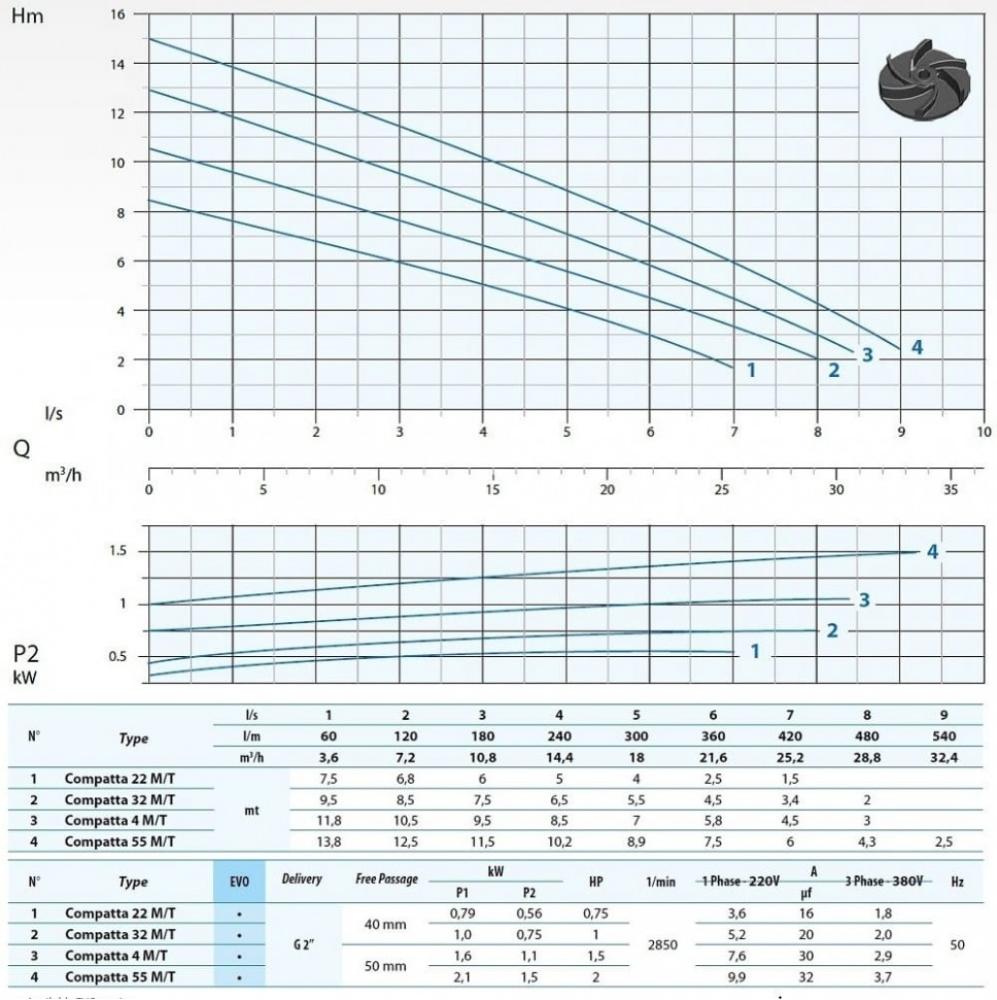 - 2 полюса 50 Гц Горизонтальный напорный патрубок (за исключением Compatta 1-1, 5 с вертикальным напорным патрубком)