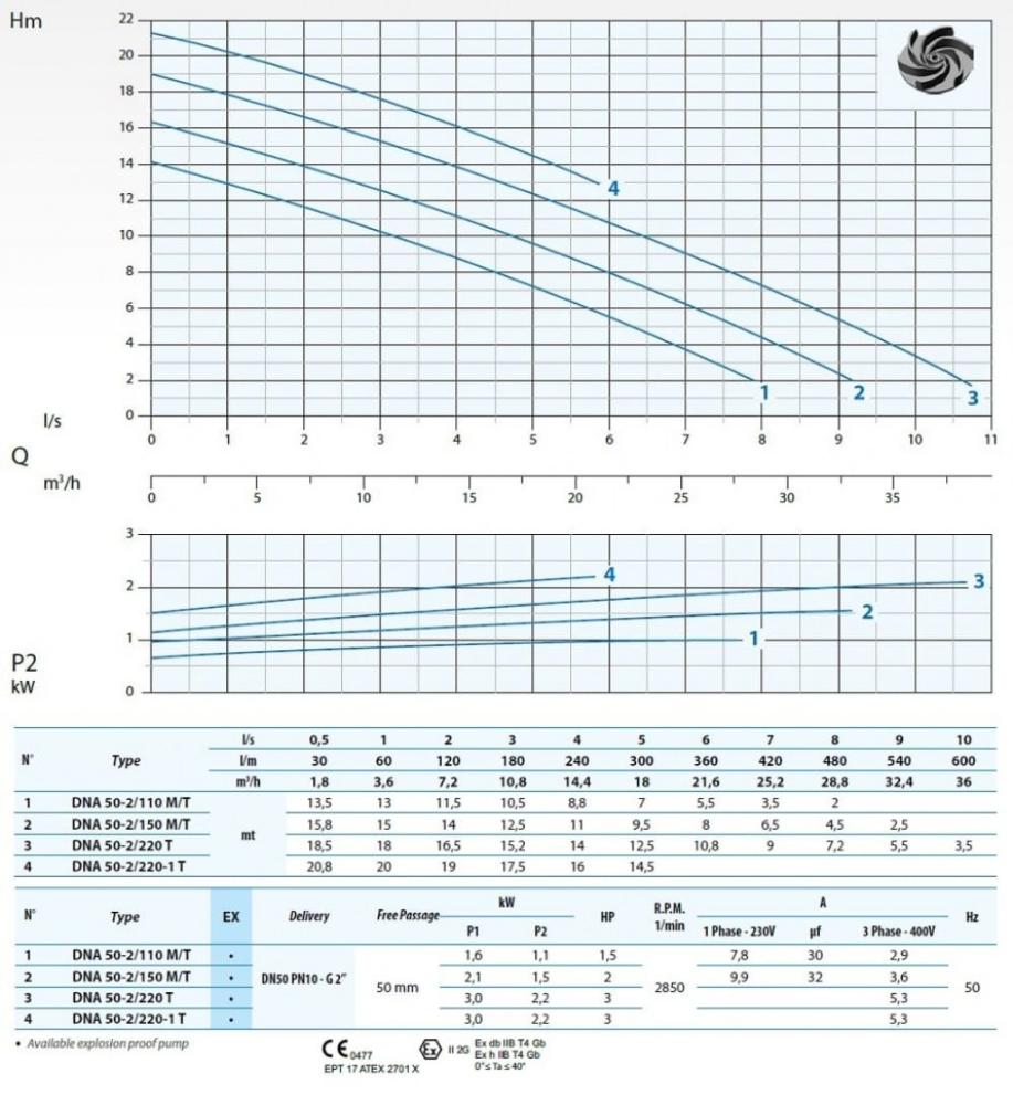 Диапазон двигателей: двигатель с короткозамкнутым ротором в исполнении с 2 и 4 полюсами; тепловая защита, встроенная в обмотку (в моделях DNA...-2/220 и DNA...-4/090 проводники тепловой защиты T1 и T2 должны быть подключены к панели управления); класс изоляции F 155°C; степень защиты двигателя IP68.