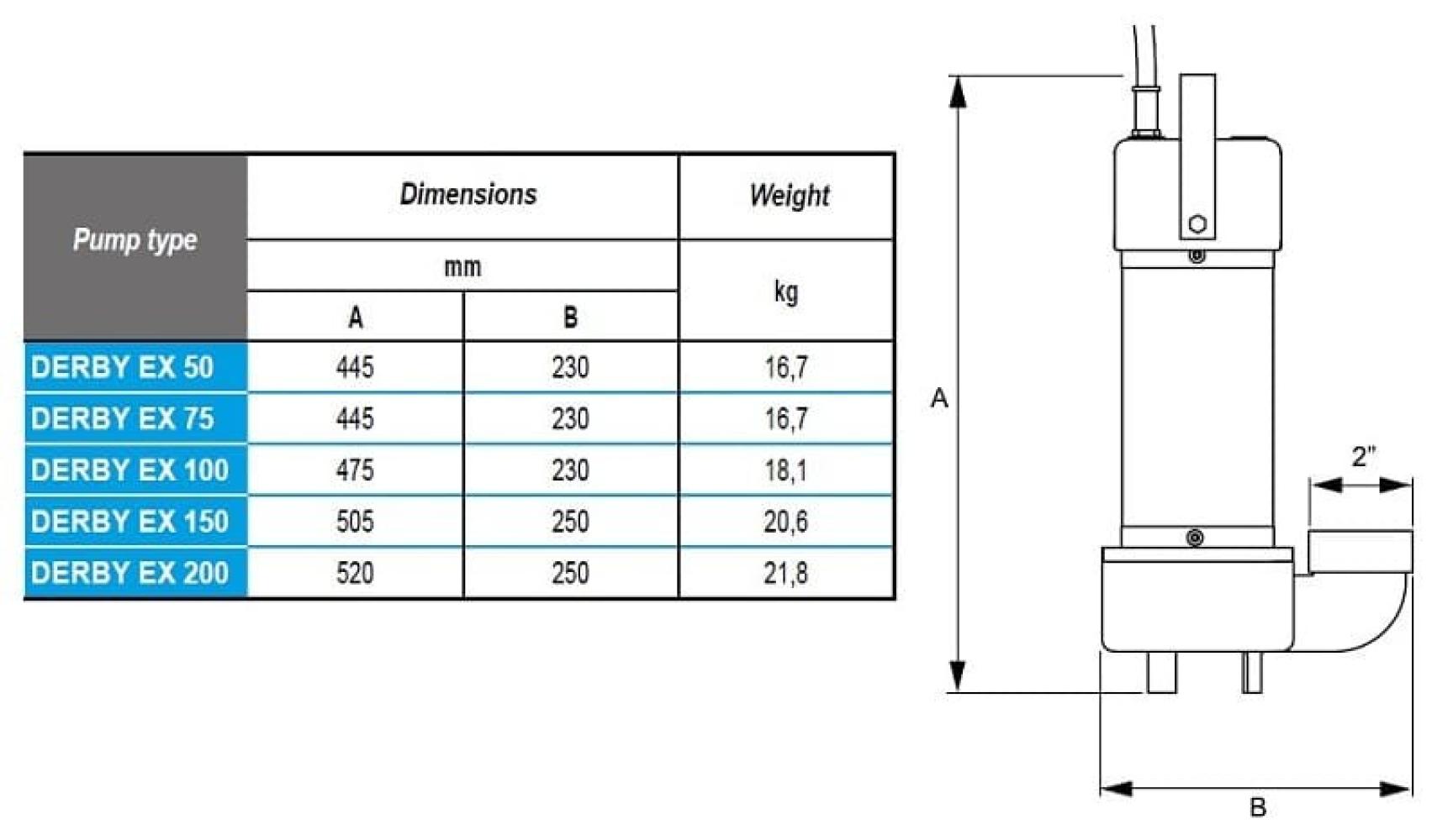 Особенности: открытое рабочее колесо из чугуна, чтобы избежать засорения грязью и другими взвешенными мелкими твердыми частицами; электрические насосы выпускаются с включенным электрическим кабелем длиной 5 м; температура перекачиваемой жидкости: не более + 40 °C; доступна версия для постоянного погружения в гидрокарбонаты (серия ID EX).