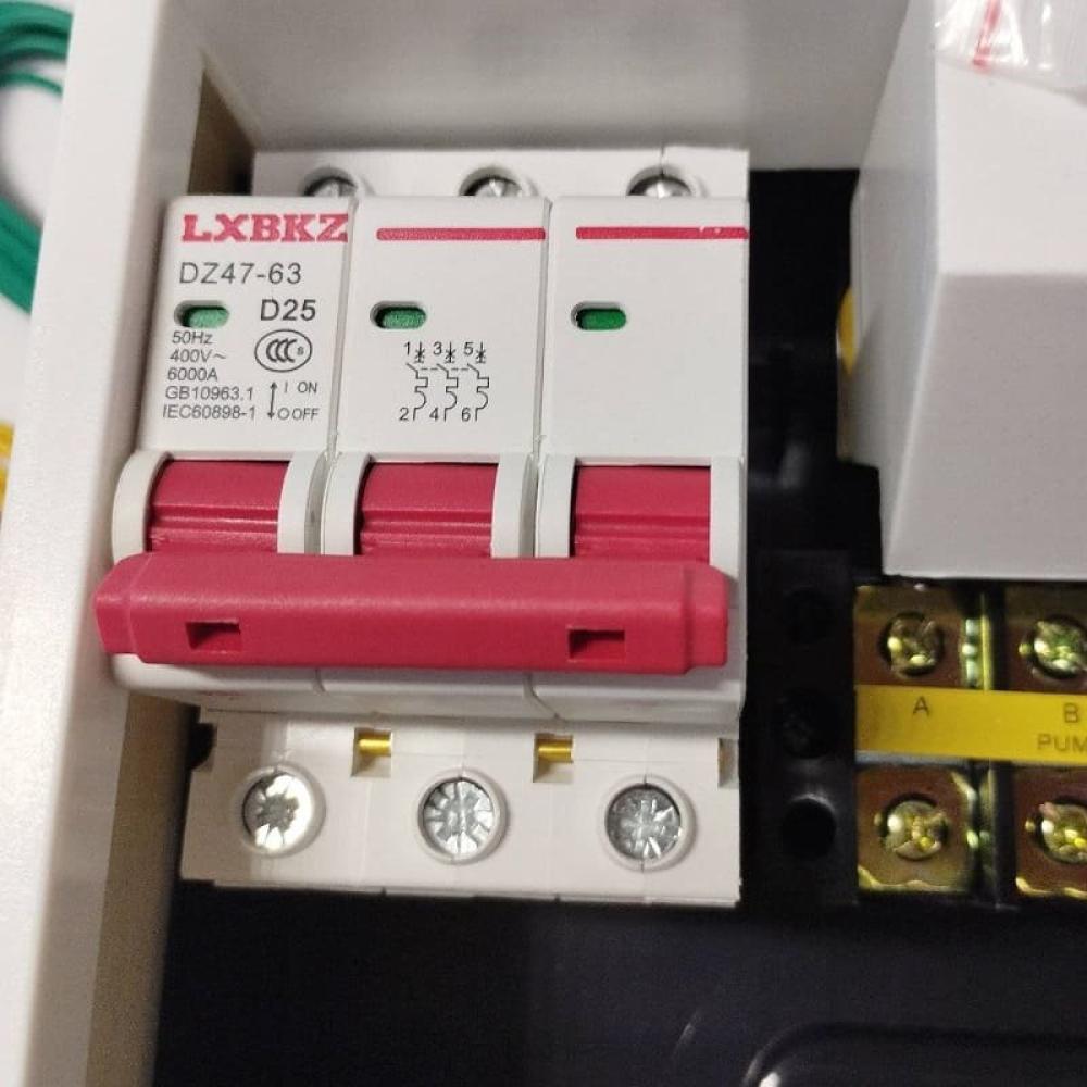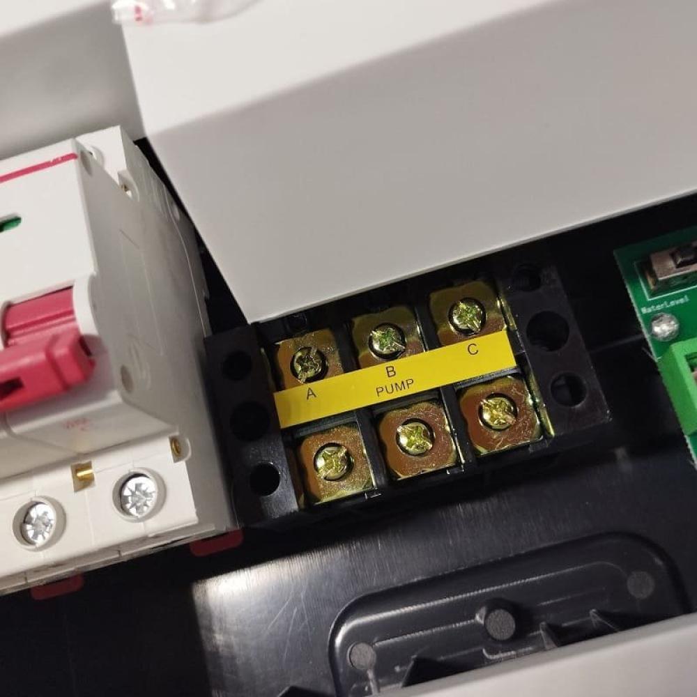 - визуализация: напряжения, двигателя, текущего, верхнего/нижнего состояния резервуара и сигналов тревоги. Верхний бак для контроля водоснабжения и нижний бак для контроля дренажа. Режим работы: переключатель АВТО/РУЧНОЙ. Индикация неисправности: отслеживание неисправностей, последние 10 причин неисправности дисплей, звуковая/световая сигнализация. Защита от длительного простоя насоса, путем кратковременного включения 1 раз в 15 дней.