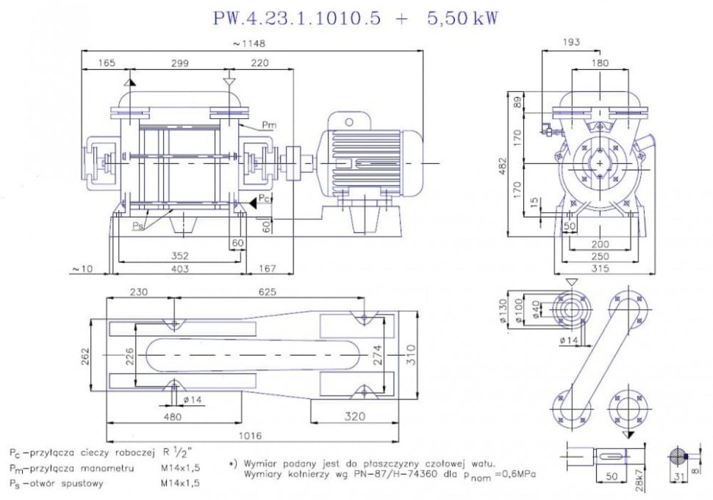 - насос и двигатель крепятся на общей опоре. Крутящий момент от двигателя передается к импеллеру через вал, установленный в подшипниках опоры и эластичную соединительную муфту. Такая конструкция делает вакуумный насос заметно длиннее и тяжелее, но зато заметно облегчает его обслуживание, когда требуется разборка насоса или замена двигателя. Кроме того, насос установлен на 2 опорах (рабочее колесо между подшипниками) что дает гораздо более длительный срок службы насосов нежели моноблока (установлен на валу двигателя или посадкой рабочего колеса) Стандартное материальное исполнение насосов: корпус насоса, звена