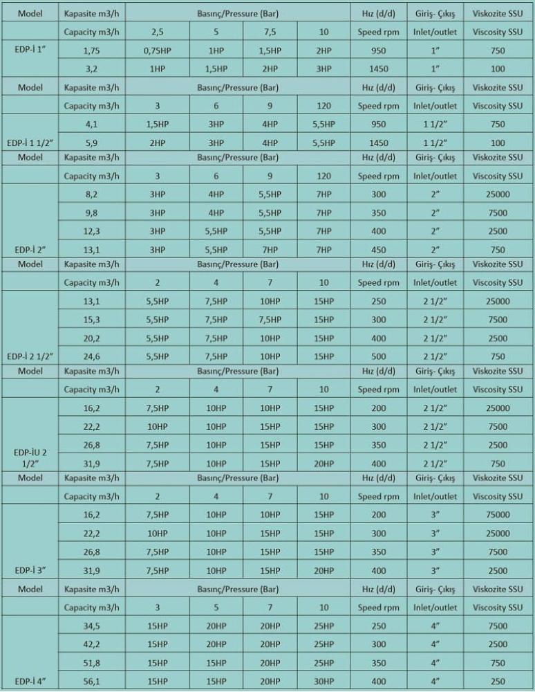Благодаря большому шагу и допуску между зубьями шестеренные насосы EMSE серии EDP-I могут перекачивать вязкие жидкости, такие как меласса, шоколад, асфальт, масло, нефтепродукты, краска, клей, растительные масла, мыло, топливо, фармацевтические изделия, химические вещества, пищевые продукты, изделия из пластмассы и резины, другие высоковязкие жидкости до давления 14 -15 бар. Благодаря объемной подаче высокое давление может достигаться даже на низких оборотах.