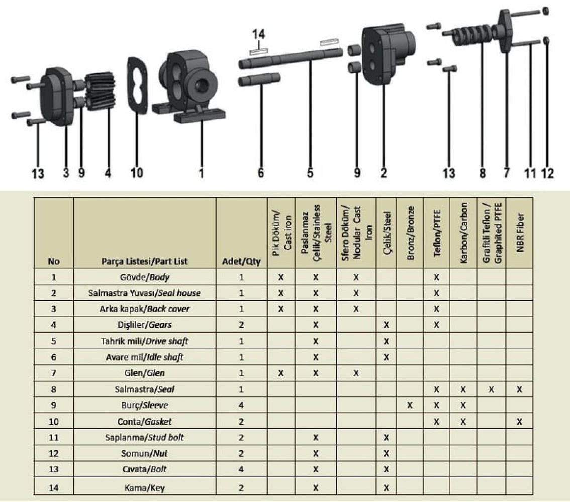 Принцип работы: в результате вращения шестерен, находящихся в постоянном зацеплении, образуется зона низкого и высокого давления. В результате этого жидкость затягивается во всасывающий патрубок и перемещаясь в зазоре между зубьями шестерни и корпуса, попадает в зону нагнетания к напорному патрубку.